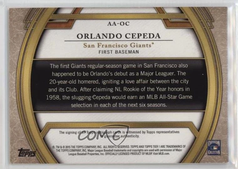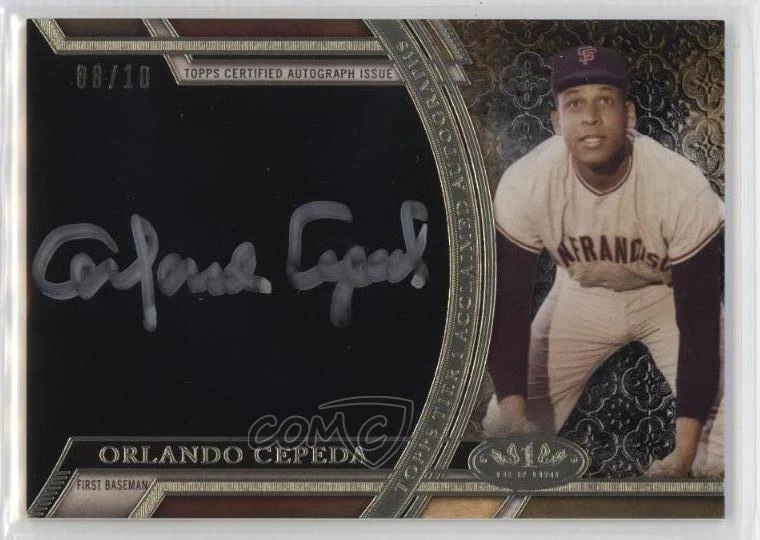 2015 Topps Tier One - Acclaimed Autographs - Silver Ink #AA-OC Orlando Cepeda Qty Made: 10 - Baseball Card - Featuring the San Francisco Giants - Featuring Orlando Cepeda Search for more: 2015 Topps Tier One Search for more: 2015 Topps Tier One - Acclaimed Autographs - Silver Ink View all of our Listings Auctions Buy It Now About Us Located in the beautiful Pacific Northwest, COMC (Check Out My Cards) is the world's largest consignment service for trading card singles. More than 10,000 people have used our consignment service to list over 50 million trading cards. We currently house 20 million cards, each listed for sale with front and back images of the actual card. Find out how we can help you consign your items on eBay by contacting us through eBay messaging. COMC -- "The Safe & Easy Way to Buy & Sell" Representative Image - Select Specific Item above to see image of actual item Representative Image - Select Specific Item above to see image of actual item Raw Condition for Modern Cards Unless otherwise noted, raw modern cards are listed in Near Mint-Mint condition or better. A NM-MT card appears to be Mint at first glance, but upon closer inspection, may exhibit some of the following: minor print defects (e.g. roller marks, print line, dimple), minor scratches, slight edge wear, and slight corner wear. Centering is clearly visible in the images provided and does not factor into our condition assessment. Raw Condition for Vintage Cards Unless otherwise noted, raw vintage cards are listed in Excellent condition or better. An EX card may exhibit some of the following: minor rounding of corners, surface wear, print defects, light scratches, and slight edge wear/chipping. Centering is clearly visible in the images provided and does not factor into our condition assessment. Domestic Shipping Combined shipping for multiple items is available. To receive combined shipping, please ensure all desired items are in your eBay shopping cart before proceeding to checkout. eBay limits orders to 40 items per order. We automatically combine multiple orders placed on the same day. If you place multiple orders on the same day, please contact us to request a refund of applicable shipping costs. Signature confirmation may be required on invoices over $400. Raw cards are shipped in toploaders. International Shipping COMC offers eBay's International Shipping (EIS) for international orders under $2,500* (see country exceptions below). All duties and import fees are paid at checkout; in the rare event that there are additional import fees upon delivery, these are borne by the buyer. EIS packages route through a shipping hub in Erlanger, KY before shipping to their final destination. Please note that EIS does not allow for combined shipments. The shipping rates are determined by eBay and cannot be adjusted. *Maximum sale price exceptions: Colombia, Kuwait ($2,000); Taiwan ($1,539); Chile, Costa Rica, Guatemala, Honduras, Trinidad and Tobago ($1,000); Antigua and Barbuda, Aruba, Belize, Dominica, Grenada, Philippines, Saint Kitts and Nevis, Saint Lucia, Montserrat, Turks and Caicos Islands ($500); Dominican Republic, El Salvador ($200). Please request a shipping quote through eBay messaging for orders that exceed the maximum sale price supported by eBay's International Shipping. You will be responsible for all duties and import fees for international orders shipped outside the EIS. Raw cards are shipped in toploaders. Payment COMC does not accept offers on our cards through our eBay storefront. COMC utilizes eBay’s managed payments system. If you are experiencing difficulties making a payment, please contact eBay for assistance. Return Policy Returns are only accepted on the rare occasion the item is not as described. If you are making a return, please initiate the return process through eBay so a mailing label can be provided for you. Prior to listing, our expert team carefully assessed this item to represent it accurately. Please review the description and high-definition images prior to purchasing to ensure this item meets your satisfaction. We welcome you to contact us if you have further questions about this item. Trust and Integrity COMC carefully assesses each item consigned to us to prevent fraudulent items from entering the marketplace. If you believe an item offered on COMC may be fraudulent, please contact us with details so we can investigate the issue. Items we determine are outside our supported items policy may be removed. Last Modified: 11/22/2024 7:07:09 PM PDT