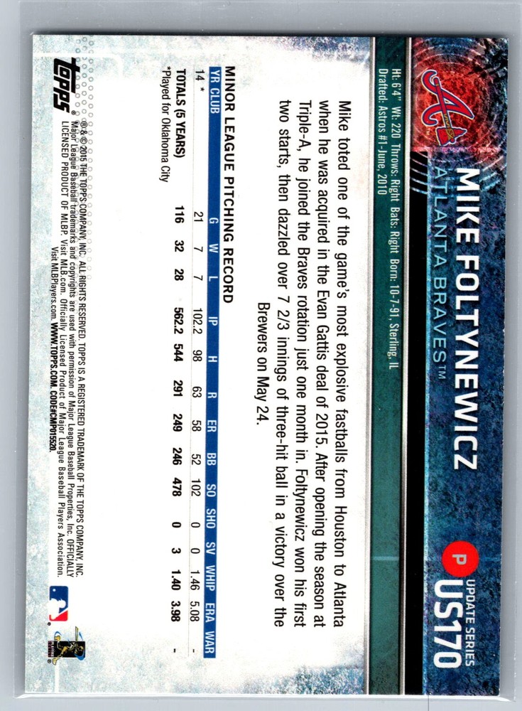 This is a nice example of a 2015 Topps Update Series #US170 Mike Foltynewicz RC.Other important information about this card:AUTOGRAPHED/Signed In 2015 Mike Foltynewicz played for the Atlanta Braves.Please check out our other listings for more great cards. This Card was autographed in person and is guaranteed to pass any verification or money back!