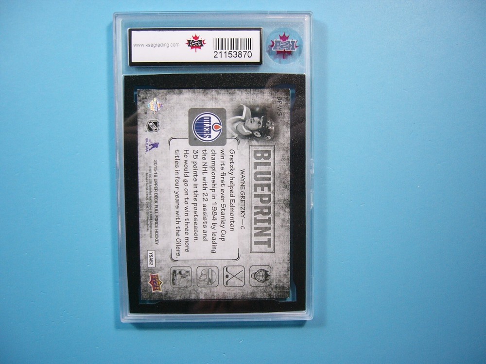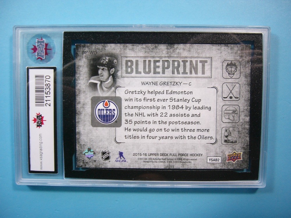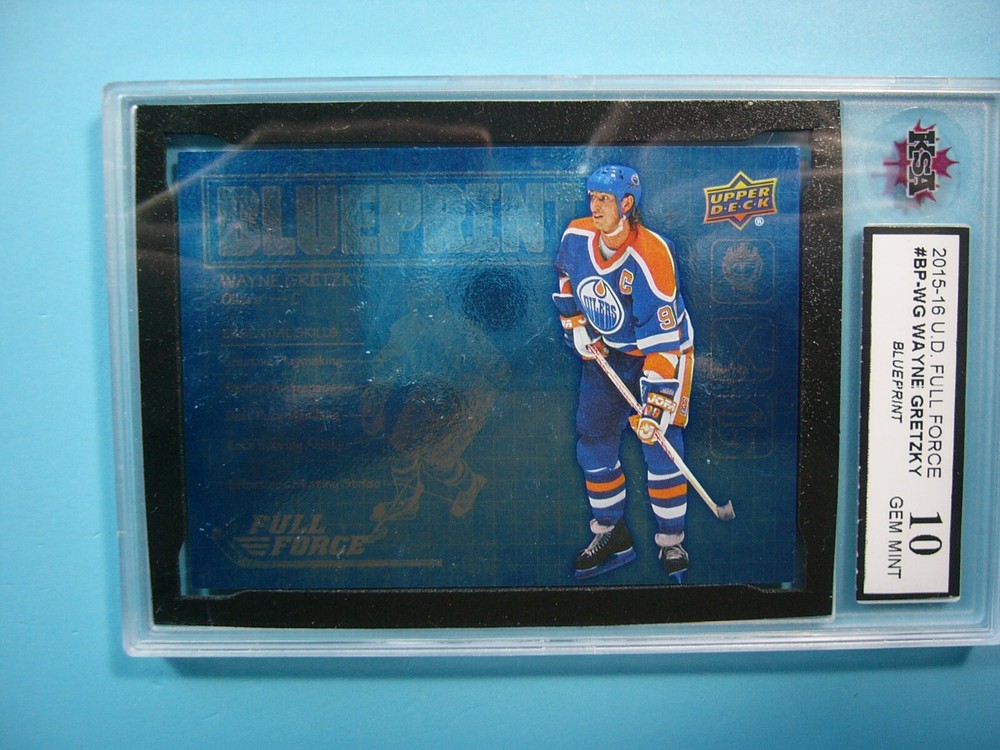 YOU ARE BIDDING ON A 2015/16 UPPER DECK FULL FORCE BLUEPRINT NHL HOCKEY CARD #BP-WG WAYNE GRETZKY , EDMONTON OILERS. CARD IS GRADED 10 BY KSA IN GEM MINT CONDITION. GREAT COLOUR & GLOSS--A SUPER SHARP, CLEAN & ATTRACTIVE KEY CARD FROM THIS VALUABLE UPPER DECK NHL HOCKEY SET!!! THANKS FOR LOOKING AND GOOD LUCK!!! ------------------------------------------------------------------------------------------------------------------------------------------------------- SHIPPING WITHIN CANADA IS $4.99. SHIPPING TO THE UNITED STATES IS $8.99 AND INCLUDES TRACKING & INSURANCE. SHIPPING INTERNATIONALLY (ANYWHERE ELSE) IS $25.00 AND INCLUDES TRACKING & INSURANCE. ITEM WILL BE CAREFULLY PACKAGED SO AS NOT TO GET DAMAGED DURING SHIPPING. IF YOU ARE IN CANADA AND WOULD LIKE SHIPPING WITH TRACKING & INSURANCE INCLUDED COST IS $12.99. PLEASE CONTACT US BEFORE PAYMENT IS MADE TO ADJUST THE INVOICE ACCORDINGLY. WE DO COMBINE SHIPPING ON MULTIPLE PURCHASES--ONLY $1.00 MORE FOR EACH ADDITIONAL SINGLE GRADED CARD OR ONLY 25 CENTS MORE FOR EACH ADDITIONAL SINGLE UNGRADED CARD. TAKE A LOOK AT OUR OTHER AUCTIONS AND SAVE ON SHIPPING!!!