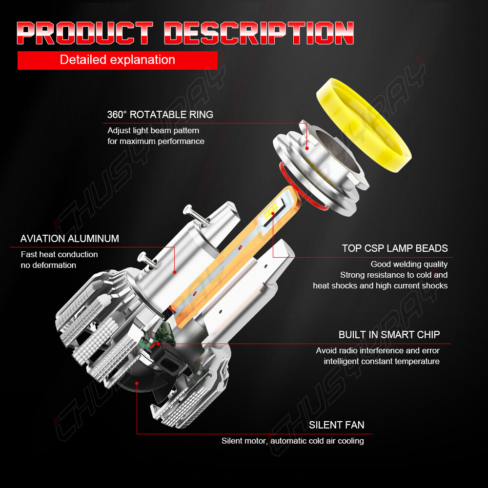 U6S Plus Series Super Bright White LED Headlight Bulb Conversion Kit 9005+H11 Replace Halogen High/Low Beam Bulb 360 Degree Adjustable Beam Angle 2x Pairs (4 pcs) New and old packaging will be shipped randomly U6S series describe The smallest size of all 6 different series LED bulbs to fit over 95% vehicles without modifying the OEM dust cap. The bulbs are also designed as small as it can to fit the assembly with bulb hole off the center. U6S series is one of the smallest LED lights on the market, with built-in driver which can perfectly fit most vehicles without installation issues. Headlight Bulbs Features: ★ 360° Adjustable Extremely Beam Pattern, Light Up Your Road U6S series H7 led headlights light, Upgrade 3570 CSP LED Chips Light Source, it output 50W/bulb, 8000LM/bulb 6000K cool white LED light. 200% brighter than Halogen headlights. Light up your road but no blind others drivers. They have a perfect beam pattern without any dark spots or foggy light. ★ TURBO FAN and WATERPROOF DESIGN The LED driver was built into the bulbs. The smallest heat system in the market, including cooling fan and cooling aluminum parts. 12,000 RPM high speed turbo fan will help the heat dissipation. In this way can ensure the bulbs lifespan last more than 5,0000 hours. 9005+H11 led headlight kit design IP67 waterproof. It can work underwater! Rainproof , it also shockproof. Buy it confidence. ★ SIMPLE TO INSTALL The U6S series is designed to be as compact as it can. Just simply take out the halogen bulbs from the housing then put the led bulbs in and the dust cover back. Just plug-N-play, no wire cutting, you can done within 20 minutes. Tips: Insert into the right slot-clockwise, rotate-led chips face 3 o’ clock and 9 o’ clock direction. Otherwise, it will happen to yellow light or blue light in the edge and the light beam will not focus. Headlight Bulbs Specifications: Plug type: 9005+H11 Wattage: 100W/set,50W/bulb Luminous Flux: 16000LM/set(8000LM/bulb) Condition: 100% Brand New / Never Used Voltage: DC 9-32V ( Fit 12V,24V Vehicle ) IP Rate: IP67 LED type: 3570 LEDs Color Temperature: 6000K-6500K White Beam Angle: 360° Operating Temperature: -40 - +80°C Lifespan: 50000+ working hours Number of Bulbs: 4 (The box is sent randomly) To Fit: Headlights KIt Placement on Vehicle: Left,Right,Front Material: Aviation 6063 Aluminum Profile Application: Headlight (High + Low Beam Head Lights ) (It is perfect for those who are looking for a better lighting output and a more aggressive look for your ride.) Install Caution: 1. As a safety precaution, make sure that the car has had time to cool down properly before starting the installation process. 2. Put the vehicle into park or make sure it is securely in gear. 3. Make sure to have the ignition turned off and the keys removed. 4. Be careful to avoid burns, especially when turning on or off the vehicles lighting. 5. Be careful to avoid crushing or cutting the bulbs. Also make sure to not touch the bulbs with your fingers, as this will cause blotting. 6. Fully examine the connection of the contact points, ports and the wires as faulty connections can cause lighting problems. 7. Make certain that the en of the bulb does not come in contact with the interior On Dec 18, 2024 at 23:27:22 PST, seller added the following information: