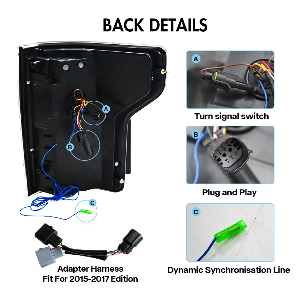 sunny-light new item Full LED Headlights Fit for Jetta MK6 2012-2018 Head Front Lamps Assembly Pair BUY NOW Pair Headlights Assembly w/ LED DRL For 2014-2021 Toyota Tundra Front Headlamps BUY NOW Pair Full LED Headlights For Toyota Tundra 2007-2013 Head Front Lamps Assembly BUY NOW RGB LED Headlights For Honda Civic 2016-2021 RGB DRL Sequential Turn Assembly BUY NOW Pair For 2022 2023 2024 Honda Civic 11th Gen Headlights LED Head Lamp Assembly BUY NOW LED Headlights For Toyota Camry 2018-2022 DRL 8-Lens Red Demon Eye Assembly BUY NOW RGB LED Tail Lights & Tailgate Light for Toyota Corolla 2020-2024 RGB Assembly BUY NOW RGB Full LED Tail Lights For 2015-2023 Ford Mustang w/ 11 Modes Sequential lamp BUY NOW Pair RGB LED Tail Lights for Honda Accord 2018-2022 RGB DRL Taillight Assembly BUY NOW LED Rear Tail Lights Assembly for Toyota US Corolla Hatchback 2020-2024 RH&LH BUY NOW RGB Color LED Headlights Assembly For Toyota Camry 2018-2024 Front Head Lamps BUY NOW Smoke LED DRL Projector Headlights For 2008-2015 Infiniti G37/Q60 Coupe 2-Door BUY NOW LED Headlights For BMW E90 E91 328 335 2005-2012 Sequential Turn Signal Assembly BUY NOW Pair Headlight For 2022-2025 11th Gen Honda Civic LED Sequential Turn Signal DRL BUY NOW LED Headlights For Toyota Camry SE LE XSE XLE TRD 2018-2023 Headlights Assembly BUY NOW Pair Full LED Headlights For VW MK7 Golf 2013-2018 Head Front Lamps Sequential BUY NOW Pair LED Headlights Red Demon Eye For 2022-2025 Honda Civic w/Startup Animation BUY NOW RGB LED Headlights For BMW 3-Series E90 E91 2005-2012 Sequential Front Lamps BUY NOW Smoked LED Tail Lights For 2015-2020 Ford F150 F-150 w/ No Blind Spot Rears Fitment: For Ford F150 F-150 2015-2020 (only fit for original tail light without Reversing Radar/ Blind Spot ) Package Includes: 1 Pair (Left Side + Right Side) Tail lights Assembly Set (Including Some Installation Accessories) Specification : Brand :TT-ABC Product Condition: 100% Brand New Type: LED Taillights Assembly A few second of Start up Animation Sequential Turn Signal Full LED, No need to purchase additional light bulbs Multiple Color DRL Control:APP on phone (Android and lOS) Functions: Running light +Brake light +Turn Signal+Reverse light+ Animation Housing Color: Black Lens Color: Smoked Operating Voltage: 12V-14V Material:High Quality ABS Plastic+PC+PMMA Color Temperature: 5500K-6500K Recommend professional installation technicians Waterproof Rate:IP68 Warranty:1 year Features: DOT-Certifed, Durable, Easy lnstalation, High Quality, OE-Certified, SAE-Cerified, Sealed Assembly, Waterproof, ISO-Certifed, Dustproof And Shurdy Note: Please confirm the year of your car/light shape/ plug of your original lights whether these information as same as our lights, if you can't confirm it, please contact us. Please double check shipping address, We are not responsible for incorrect or undeliverable addresses.You can't change your shipping address after placing an order. Please Using your factory supplied connector/harness will avoid cutting or modifying any wires. We only provide electronic invoice "packing slip", if you need it, please note or contact us when you place an order. We will open the box and inspect the returned item to see if it is intact and the correct item before refunding you. If there is a problem with the product, please feel free to contact us, we can help you solve it as soon as quickly! About us Payment Shipping Returns Contact us Feedback My store specializes in selling various car modification and customization products, including headlights, high beams, low beams, fog lights, contour lights, turn signals, brake lights, reverse lights, and interior lighting. At the same time, we have our own production factory and cooperate with hundreds of component factories, committed to providing customers with high-quality products, the most favorable prices, and a professional after-sales customer service team. Our goal is to meet the needs of our customers and provide them with an excellent shopping experience. 1.We can accept payment method is PayPal, Google Pay, Visa, Master Card, Amex and Discover and other payment way. 2.Immediate payment needs to be processed for items with Add to Cart option so that any promotional discounts can be applied to your order immediately. 3.Please confirm if the address and postal code are correct before placing an order! Convenient and fast shipping. 1.The package is Shipping from the US Stock by USPS,FedEx or UPS . 2.Shipment will be made within 1 business day after payment, and delivery will take 1-5 business days (excluding packages with a unit price below $50) 3.Please offer us your telephone number and correct zip code,or your order will be delayed since the courier will need it for the delivery.(not ship to Alaska, Hawaii and Puerto Rico). 4.Shipping Fee is include packing & handling charges. 5.International Customers:Import duties, taxes, value added tax and Other charges are Not Includes in the item price or shipping charges. These charges are the buyer’s responsibility and vary by country/location.These charges are not to be confused for additional shipping charges. 6.Please check with your country’s customs office to determine what these additional costs will be prior to bidding/buying. These charges are normally collected by the delivering freight (shipping) company or when you pick the item up. These charges are not to be confused for additional shipping charges. There are some tips for you: 1. If There are any problems with the product, please contact with us before leaving neutral and negative reviews feedback ,give me a Chance to make it right 2. If you are in our exclusion countries. Please write to us for shipping .If When the goods arrive, please check them carefully 3. If you find that the goods have been damaged, please be sure to refuse to collect the goods and ask the courier to return the goods to us. If the goods are damaged, please do not collect. 4. If the item you have ordered 