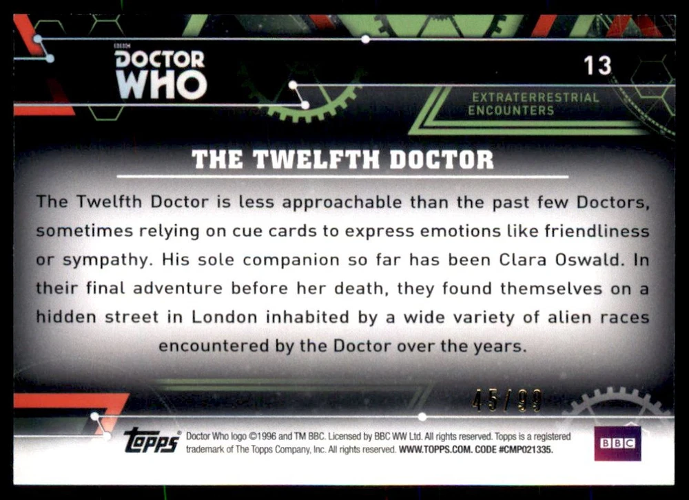 2016 Doctor Who Extraterrestrial Encounters Blue #13 The Twelfth Doctor /99 Front Back Sport: Non-sports Set: 2016 Topps Doctor Who Extraterrestrial Encounters Blue Year: 2016 Item#: 13 Attributes: Serial Numbered Manufacturer: Topps Co. Grading Company: Raw Grade SetType: Parallel Item Condition: Near Mint/Mint 2014 Beckett Collectibles, LLC. All Rights Reserved Powered by: Thank you for choosing Burbank Sportscards, the sports cards superstore. We offer a large selection of singles across all sports. Visit our ebay store to view all our items available. Our Shipping Policy We offer Free Standard Shipping to all Domestic customers. Options for Expedited shipping are also available at checkout. For our international customers, shipping is $9.99 for the first item, and $0.25 for each additional item. Note to all customers: To qualify for combines shipping, we ask our customers to add items into the shopping cart. Please note, we do not combine orders that are placed separately. Our Service: Generally, our turnaround is super quick as we process and send out orders same day payment is received. Stock Availability: We do our best to ensure all items are in stock; however, in case of the rare stock out, the customer will have the option for a replacement card, or we will process a refund so the order is not held up. Our Images: Many of our images are stock photos from Beckett archives. They are a representation of the actual card you would receive. If you have any questions regarding the item you're interested in, please feel free to ask (serial numbers and relic pieces may vary) Moreover, in a case of a wrong or defective photo, please notify us, so we can adjust it. Other FAQ's: -When buying multiple cards, do you top load each item? No; however, we do try to insure all items are shipped securely. If you wish to have all of your cards top loaded it is a paid service and can be arranged. Please email for more details. For other questions, please feel free to ask. Thank you.
