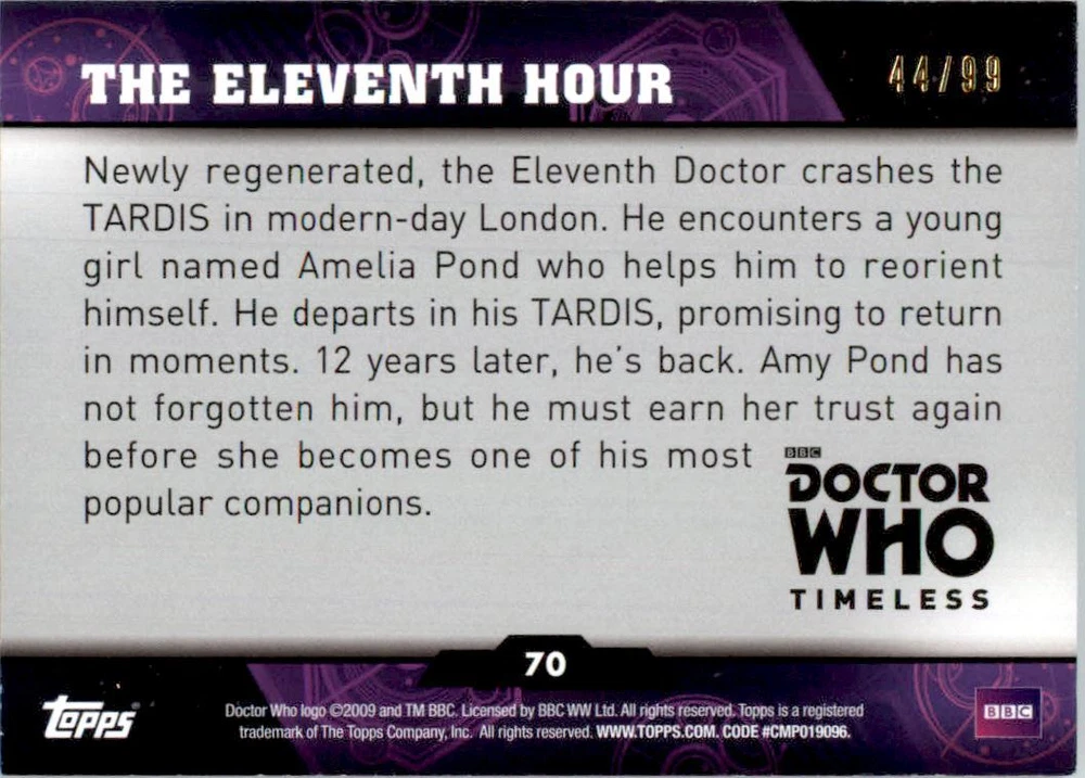 2016 Doctor Who Timeless Blue #70 The Eleventh Hour /99 Front Back Sport: Non-sports Set: 2016 Topps Doctor Who Timeless Blue Year: 2016 Item#: 70 Attributes: Serial Numbered Manufacturer: Topps Co. Grading Company: Raw Grade SetType: Parallel Item Condition: Near Mint/Mint 2014 Beckett Collectibles, LLC. All Rights Reserved Powered by: Thank you for choosing Burbank Sportscards, the sports cards superstore. We offer a large selection of singles across all sports. Visit our ebay store to view all our items available. Our Shipping Policy We offer Free Standard Shipping to all Domestic customers. Options for Expedited shipping are also available at checkout. For our international customers, shipping is $9.99 for the first item, and $0.25 for each additional item. Note to all customers: To qualify for combines shipping, we ask our customers to add items into the shopping cart. Please note, we do not combine orders that are placed separately. Our Service: Generally, our turnaround is super quick as we process and send out orders same day payment is received. Stock Availability: We do our best to ensure all items are in stock; however, in case of the rare stock out, the customer will have the option for a replacement card, or we will process a refund so the order is not held up. Our Images: Many of our images are stock photos from Beckett archives. They are a representation of the actual card you would receive. If you have any questions regarding the item you're interested in, please feel free to ask (serial numbers and relic pieces may vary) Moreover, in a case of a wrong or defective photo, please notify us, so we can adjust it. Other FAQ's: -When buying multiple cards, do you top load each item? No; however, we do try to insure all items are shipped securely. If you wish to have all of your cards top loaded it is a paid service and can be arranged. Please email for more details. For other questions, please feel free to ask. Thank you.