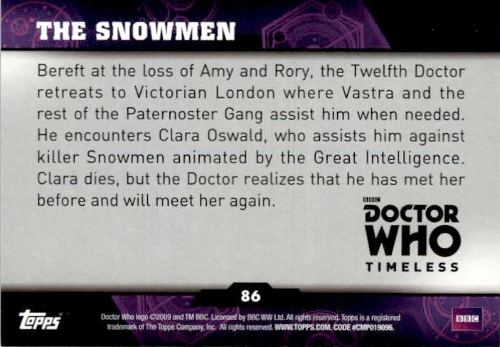 2016 Doctor Who Timeless Green #86 The Snowmen Front Back Sport: Non-sports Set: 2016 Topps Doctor Who Timeless Green Year: 2016 Item#: 86 Manufacturer: Topps Co. Grading Company: Raw Grade SetType: Parallel Item Condition: Near Mint/Mint 2014 Beckett Collectibles, LLC. All Rights Reserved Powered by: Thank you for choosing Burbank Sportscards, the sports cards superstore. We offer a large selection of singles across all sports. Visit our ebay store to view all our items available. Our Shipping Policy We offer Free Standard Shipping to all Domestic customers. Options for Expedited shipping are also available at checkout. For our international customers, shipping is $9.99 for the first item, and $0.25 for each additional item. Note to all customers: To qualify for combines shipping, we ask our customers to add items into the shopping cart. Please note, we do not combine orders that are placed separately. Our Service: Generally, our turnaround is super quick as we process and send out orders same day payment is received. Stock Availability: We do our best to ensure all items are in stock; however, in case of the rare stock out, the customer will have the option for a replacement card, or we will process a refund so the order is not held up. Our Images: Many of our images are stock photos from Beckett archives. They are a representation of the actual card you would receive. If you have any questions regarding the item you're interested in, please feel free to ask (serial numbers and relic pieces may vary) Moreover, in a case of a wrong or defective photo, please notify us, so we can adjust it. Other FAQ's: -When buying multiple cards, do you top load each item? No; however, we do try to insure all items are shipped securely. If you wish to have all of your cards top loaded it is a paid service and can be arranged. Please email for more details. For other questions, please feel free to ask. Thank you.