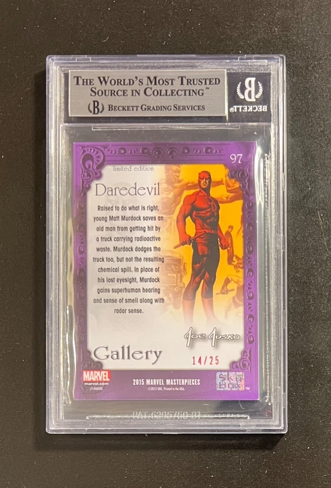2016 MARVEL MASTERPIECES # 97 DAREDEVIL RED GALLERY CANVAS CARD. (RAINBOW SILVER) CASE HIT /25 CARD IS GRADED BY BECKETT GRADING SERVICES AT NM/M+ CONDITION 8.5. REFRACTOR CARD AND SLAB ARE IN GREAT CONDITION. ALL MY ITEMS COME FROM A SMOKE-FREE HOUSE. SHIPMENT WILL BE SENT IN 2 DAYS OF PAYMENT. I WILL SHIP THIS CARD IN THE GREATEST OF CARE. BUYERS OUTSIDE OF THE CONTINENTAL U.S. MAY HAVE TO PAY EXTRA FOR SHIPPING. I DO OFFER COMBINE SHIPPING RATES. SO PLEASE CHECK OUT MY OTHER ITEMS . FEEL FREE TO MESSAGE ME WITH ANY QUESTIONS. THANKS FOR LOOKING AND GOOD LUCK.