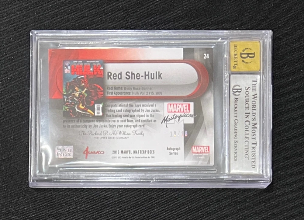 2016 MARVEL MASTERPIECES # 24 RED SHE-HULK SILVER SPECTRUM AUTOGRAPH CARD. CASE HIT /10 CARD IS GRADED BY BECKETT GRADING SERVICES AT MINT CONDITION 9. 10/10 CARD IS SIGNED BY ARTIST JOE JUSKO AND CERTIFIED BY THE UPPER DECK COMPANY. CARD AND SLAB ARE IN GREAT CONDITION. ALL MY ITEMS COME FROM A SMOKE-FREE HOUSE. SHIPMENT WILL BE SENT IN 2 DAYS OF PAYMENT. I WILL SHIP THIS CARD IN THE GREATEST OF CARE. BUYERS OUTSIDE OF THE CONTINENTAL U.S. MAY HAVE TO PAY EXTRA FOR SHIPPING. I DO OFFER COMBINE SHIPPING RATES. SO PLEASE CHECK OUT MY other items . FEEL FREE TO MESSAGE ME WITH ANY QUESTIONS. THANKS FOR LOOKING AND GOOD LUCK.