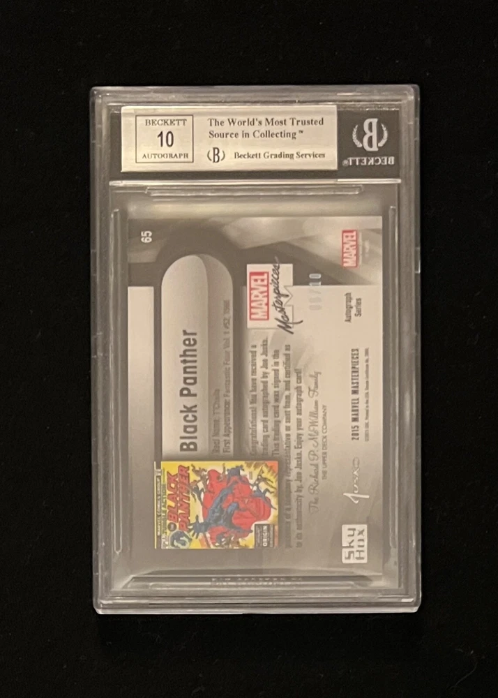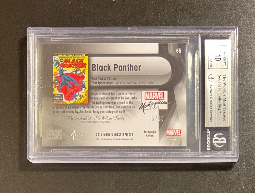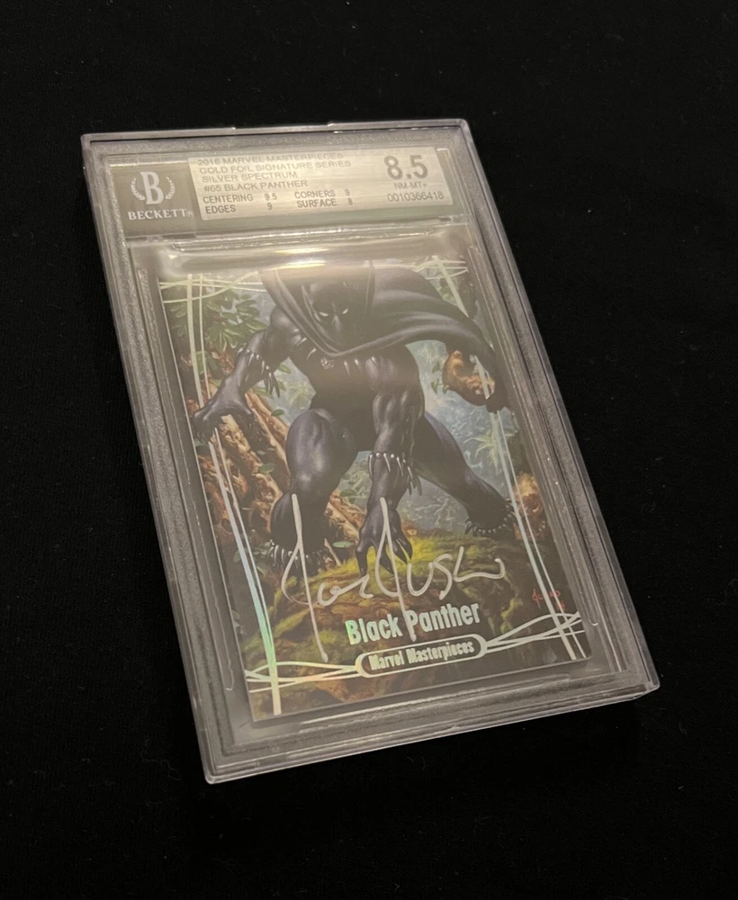 2016 MARVEL MASTERPIECES # 65 BLACK PANTHER SILVER SPECTRUM AUTOGRAPH CARD. CASE HIT /10 CARD IS GRADED BY BECKETT GRADING SERVICES AT NM/M+ CONDITION 8.5. 06/10 CARD IS SIGNED BY ARTIST JOE JUSKO AND CERTIFIED BY THE UPPER DECK COMPANY. RAINBOW REFRACTOR CARD AND SLAB ARE IN GREAT CONDITION. ALL MY ITEMS COME FROM A SMOKE-FREE HOUSE. SHIPMENT WILL BE SENT IN 2 DAYS OF PAYMENT. I WILL SHIP THIS CARD IN THE GREATEST OF CARE. BUYERS OUTSIDE OF THE CONTINENTAL U.S. MAY HAVE TO PAY EXTRA FOR SHIPPING. I DO OFFER COMBINE SHIPPING RATES. SO PLEASE CHECK OUT MY other items . FEEL FREE TO MESSAGE ME WITH ANY QUESTIONS. THANKS FOR LOOKING AND GOOD LUCK.
