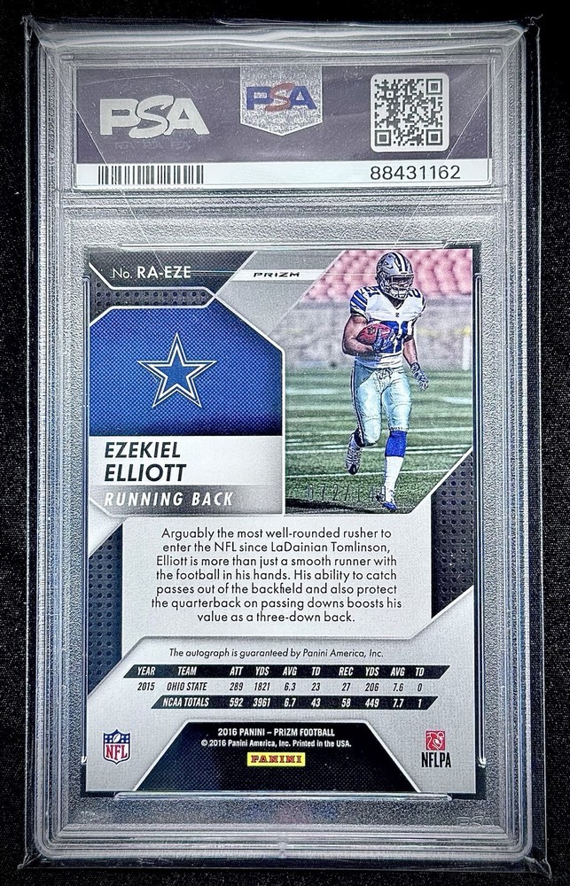 Secured packaging, bubble mailer USPS First Class Tracking Elevate your sports memorabilia collection with the 2016 Panini Prizm Blue Wave Ezekiel Elliott rookie card, graded PSA 10 GEM. This coveted card features the Dallas Cowboys' standout running back in his rookie season, showcasing his potential on the field. The Blue Wave Prizm parallel variety adds an eye-catching design, making it a standout piece. Autographed by Elliott himself and authenticated by PSA, this card comes with a label or sticker autograph, ensuring its authenticity and value. The card is crafted from high-quality card stock and is part of the 2016 NFL season set, a must-have for any serious collector or football enthusiast looking to capture a piece of the game's history.