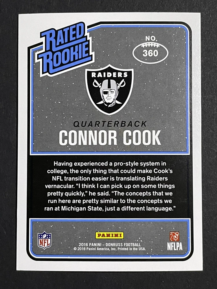 Language: English League: National Football League (NFL) Sport: Football Type: Sports Trading Card Manufacturer: Panini Season: 2016 Features: Rookie Player/Athlete: Connor Cook Material: Card Stock Country/Region of Manufacture: United States Team: Miami Dolphins, Buffalo Bills, New York Jets, Denver Broncos, New England Patriots, Kansas City Chiefs, Oakland Raiders, San Diego Chargers, Indianapolis Colts, Jacksonville Jaguars, Cincinnati Bengals, Pittsburgh Steelers, Cleveland Browns, Dallas Cowboys, New York Giants, Philadelphia Eagles, Washington Commanders, Tampa Bay Buccaneers, Atlanta Falcons, Carolina Panthers, San Francisco 49ers, Seattle Seahawks, Arizona Cardinals, Los Angeles Rams, Green Bay Packers, Detroit Lions, Minnesota Vikings, Chicago Bears Original/Licensed Reprint: Original Card Size: Standard Set: 2016 Donruss Autographed: No