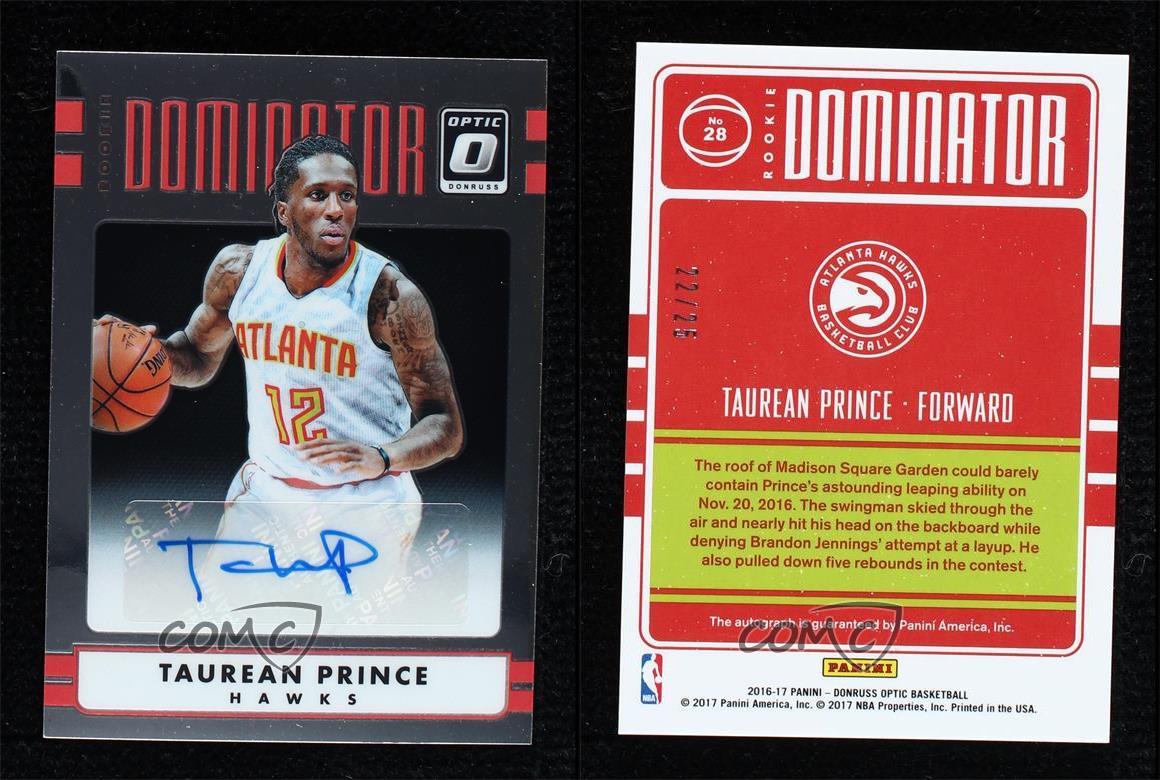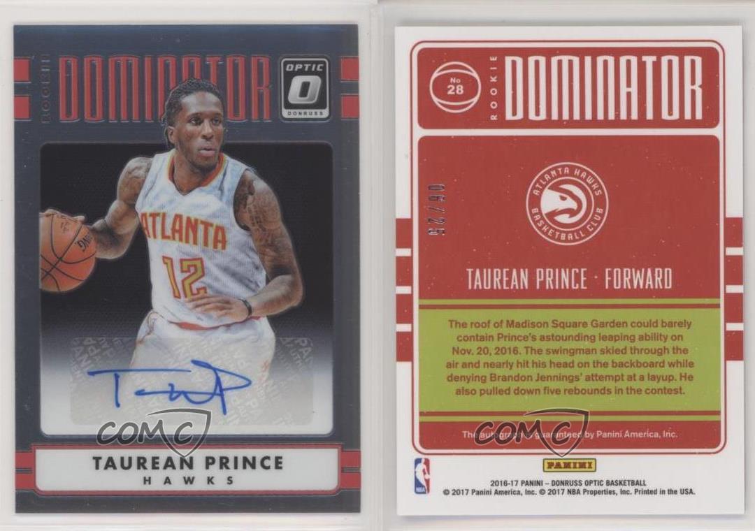 2016-17 Panini Donruss Optic - Rookie Dominator Signatures #28 Taurean Prince Qty Made: 25 - Rookie - Basketball Card - Featuring the Atlanta Hawks - Featuring Taurean Prince Search for more: 2016-17 Panini Donruss Optic Search for more: 2016-17 Panini Donruss Optic - Rookie Dominator Signatures View all of our Listings Auctions Buy It Now About Us Located in the beautiful Pacific Northwest, COMC (Check Out My Cards) is the world's largest consignment service for trading card singles. More than 10,000 people have used our consignment service to list over 50 million trading cards. Find out how we can help you consign your items on eBay by contacting us through eBay messaging. COMC -- "The Safe & Easy Way to Buy & Sell" Representative Image - Select Specific Item above to see image of actual item Representative Image - Select Specific Item above to see image of actual item Raw Condition for Modern Cards Unless otherwise noted, raw modern cards are listed in Near Mint-Mint condition or better. A NM-MT card appears to be Mint at first glance, but upon closer inspection, may exhibit some of the following: minor print defects (e.g. roller marks, print line, dimple), minor scratches, slight edge wear, and slight corner wear. Centering is clearly visible in the images provided and does not factor into our condition assessment. Raw Condition for Vintage Cards Unless otherwise noted, raw vintage cards are listed in Excellent condition or better. An EX card may exhibit some of the following: minor rounding of corners, surface wear, print defects, light scratches, and slight edge wear/chipping. Centering is clearly visible in the images provided and does not factor into our condition assessment. Domestic Shipping Combined shipping for multiple items is available. To receive combined shipping, please ensure all desired items are in your eBay shopping cart before proceeding to checkout. eBay limits orders to 40 items per order. We automatically combine multiple orders placed on the same day. If you place multiple orders on the same day, please contact us to request a refund of applicable shipping costs. Signature confirmation may be required on invoices over $400. All cards are protected and shipped securely. International Shipping COMC offers eBay's International Shipping (EIS) for international orders under $2,500* (see country exceptions below). All duties and import fees are paid at checkout; in the rare event that there are additional import fees upon delivery, these are borne by the buyer. EIS packages route through a shipping hub in Erlanger, KY before shipping to their final destination. Please note that EIS does not allow for combined shipments. The shipping rates are determined by eBay and cannot be adjusted. *Maximum sale price exceptions: Colombia, Kuwait ($2,000); Taiwan ($1,539); Chile, Costa Rica, Guatemala, Honduras, Trinidad and Tobago ($1,000); Antigua and Barbuda, Aruba, Belize, Dominica, Grenada, Philippines, Saint Kitts and Nevis, Saint Lucia, Montserrat, Turks and Caicos Islands ($500); Dominican Republic, El Salvador ($200). Please request a shipping quote through eBay messaging for orders that exceed the maximum sale price supported by eBay's International Shipping. You will be responsible for all duties and import fees for international orders shipped outside the EIS. All cards are protected and shipped securely. Payment COMC does not accept offers on our cards through our eBay storefront. COMC utilizes eBay’s managed payments system. If you are experiencing difficulties making a payment, please contact eBay for assistance. Return Policy Returns are only accepted on the rare occasion the item is not as described. If you are making a return, please initiate the return process through eBay so a mailing label can be provided for you. Prior to listing, our expert team carefully assessed this item to represent it accurately. Please review the description and high-definition images prior to purchasing to ensure this item meets your satisfaction. We welcome you to contact us if you have further questions about this item. Trust and Integrity COMC carefully assesses each item consigned to us to prevent fraudulent items from entering the marketplace. If you believe an item offered on COMC may be fraudulent, please contact us with details so we can investigate the issue. Items we determine are outside our supported items policy may be removed. Last Modified: 1/31/2025 10:17:39 PM PDT