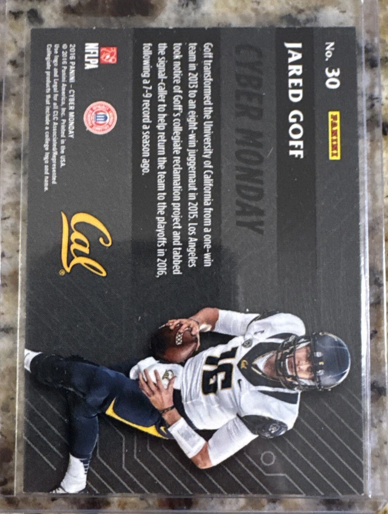 This 2016 Panini Jared Goff Rookie Cyber Monday SP RC Lions trading card is a must-have for any avid collector. Featuring a short print and rookie designation, this card is sure to be a valuable addition to your collection. The card is in excellent shape, with a near mint or better condition rating. The card set is from the 2016 Panini football collection and features Jared Goff, the quarterback for the Detroit Lions. It is a sports trading card and is perfect for fans of the Lions or collectors of football trading cards. The card is ungraded, but the quality of the card is excellent.
