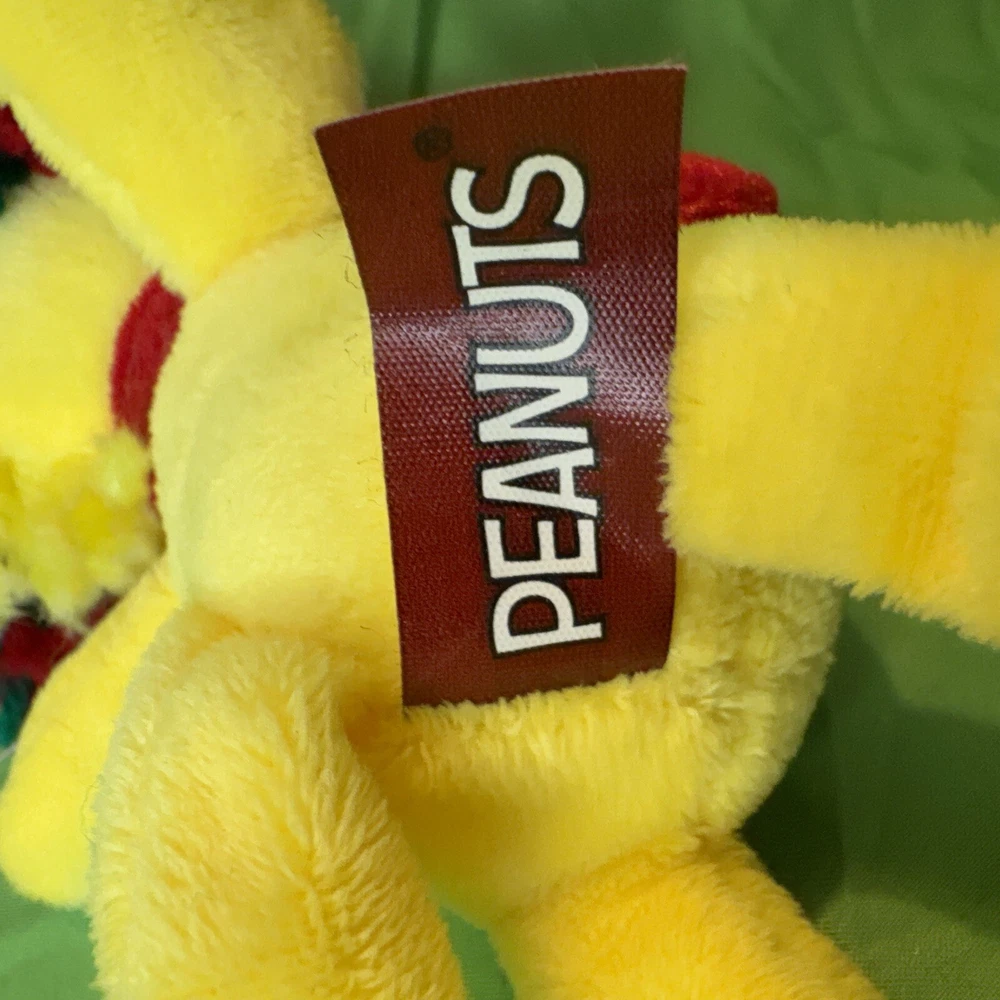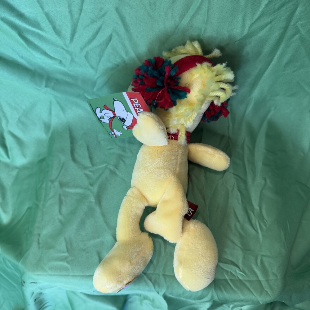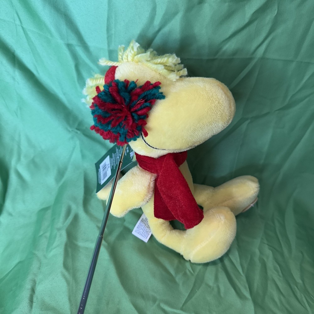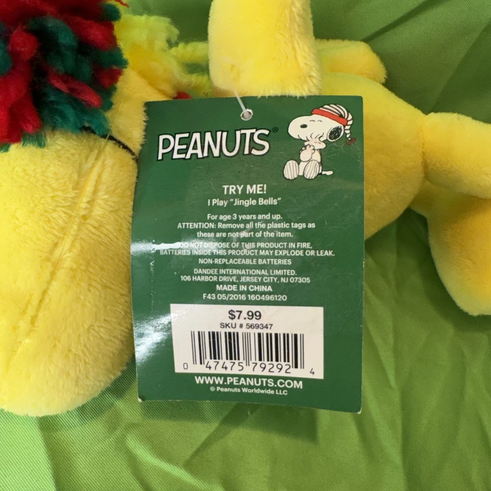 Woodstock Christmas. This 2016 Peanuts Snoopy Musical Jingle Bells plush toy is perfect for the holiday season. With its colorful yellow design and festive music feature, it will bring joy to children and adults alike. The 9" plush toy is made by Dan Dee and is recommended for children ages 3 and up. The toy depicts Snoopy, a beloved character from the Peanuts family, and is designed to mimic a bird with its beak and wings. It is a great addition to any Christmas decoration and will make a great gift for any fan of the Peanuts franchise. Made in China, this plush toy will surely bring a touch of holiday cheer to any home. Music is getting weak so not a draw for buying. But Woodstock is in great shape and still has his tags.