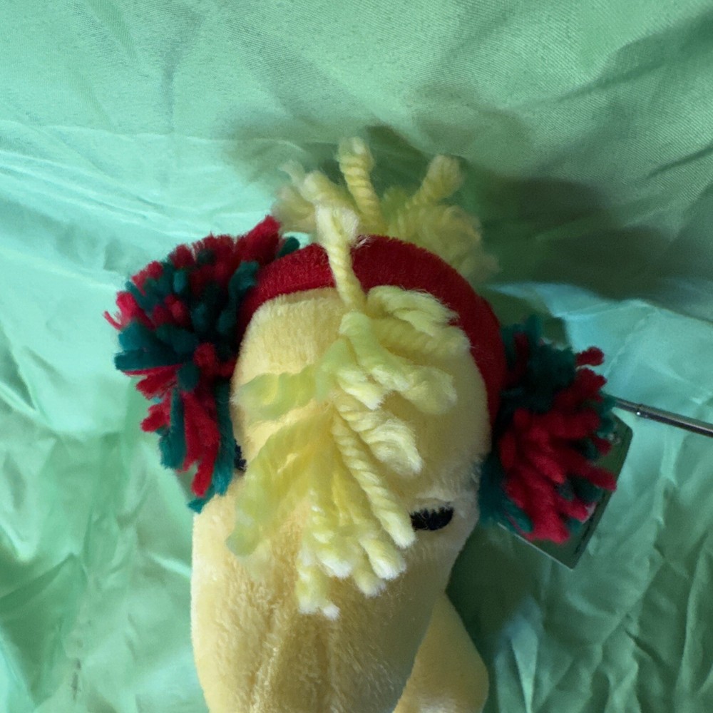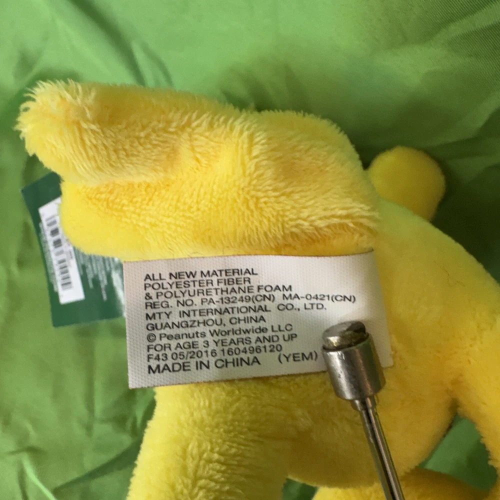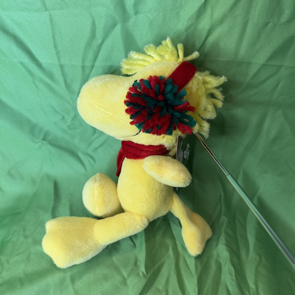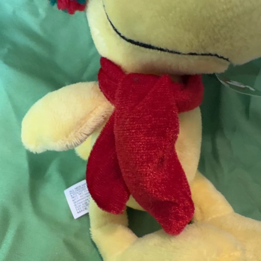Woodstock Christmas. This 2016 Peanuts Snoopy Musical Jingle Bells plush toy is perfect for the holiday season. With its colorful yellow design and festive music feature, it will bring joy to children and adults alike. The 9" plush toy is made by Dan Dee and is recommended for children ages 3 and up. The toy depicts Snoopy, a beloved character from the Peanuts family, and is designed to mimic a bird with its beak and wings. It is a great addition to any Christmas decoration and will make a great gift for any fan of the Peanuts franchise. Made in China, this plush toy will surely bring a touch of holiday cheer to any home. Music is getting weak so not a draw for buying. But Woodstock is in great shape and still has his tags.