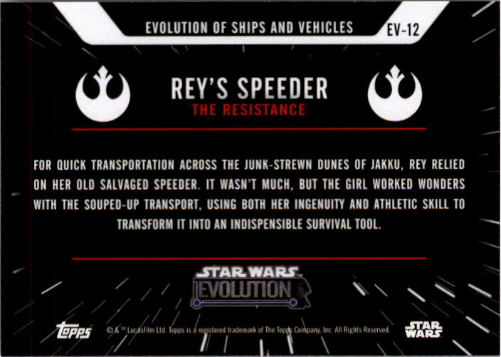 2016 Star Wars Evolution Evolution of Vehicles and Ships Card #EV12 Reys Speeder Front Back Sport: Non-sports Set: 2016 Topps Star Wars Evolution Evolution of Vehicles and Ships Year: 2016 Item#: EV12 Manufacturer: Topps Co. Grading Company: Raw Grade SetType: Insert Item Condition: Near Mint/Mint 2014 Beckett Collectibles, LLC. All Rights Reserved Powered by: Thank you for choosing Burbank Sportscards, the sports cards superstore. We offer a large selection of singles across all sports. Visit our ebay store to view all our items available. Our Shipping Policy We offer Free Standard Shipping to all Domestic customers. Options for Expedited shipping are also available at checkout. For our international customers, shipping is $9.99 for the first item, and $0.25 for each additional item. Note to all customers: To qualify for combines shipping, we ask our customers to add items into the shopping cart. Please note, we do not combine orders that are placed separately. Our Service: Generally, our turnaround is super quick as we process and send out orders same day payment is received. Stock Availability: We do our best to ensure all items are in stock; however, in case of the rare stock out, the customer will have the option for a replacement card, or we will process a refund so the order is not held up. Our Images: Many of our images are stock photos from Beckett archives. They are a representation of the actual card you would receive. If you have any questions regarding the item you're interested in, please feel free to ask (serial numbers and relic pieces may vary) Moreover, in a case of a wrong or defective photo, please notify us, so we can adjust it. Other FAQ's: -When buying multiple cards, do you top load each item? No; however, we do try to insure all items are shipped securely. If you wish to have all of your cards top loaded it is a paid service and can be arranged. Please email for more details. For other questions, please feel free to ask. Thank you.