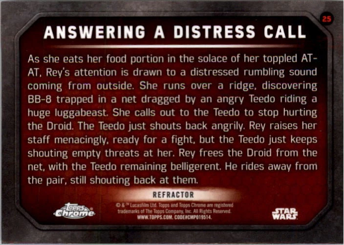 2016 Star Wars The Force Awakens Chrome Refractors Card #25 Distress Call Front Back Sport: Non-sports Set: 2016 Topps Chrome Star Wars The Force Awakens Refractors Year: 2016 Item#: 25 Manufacturer: Topps Co. Grading Company: Raw Grade SetType: Parallel Item Condition: Near Mint/Mint 2014 Beckett Collectibles, LLC. All Rights Reserved Powered by: Thank you for choosing Burbank Sportscards, the sports cards superstore. We offer a large selection of singles across all sports. Visit our ebay store to view all our items available. Our Shipping Policy We offer Free Standard Shipping to all Domestic customers. Options for Expedited shipping are also available at checkout. For our international customers, shipping is $9.99 for the first item, and $0.25 for each additional item. Note to all customers: To qualify for combines shipping, we ask our customers to add items into the shopping cart. Please note, we do not combine orders that are placed separately. Our Service: Generally, our turnaround is super quick as we process and send out orders same day payment is received. Stock Availability: We do our best to ensure all items are in stock; however, in case of the rare stock out, the customer will have the option for a replacement card, or we will process a refund so the order is not held up. Our Images: Many of our images are stock photos from Beckett archives. They are a representation of the actual card you would receive. If you have any questions regarding the item you're interested in, please feel free to ask (serial numbers and relic pieces may vary) Moreover, in a case of a wrong or defective photo, please notify us, so we can adjust it. Other FAQ's: -When buying multiple cards, do you top load each item? No; however, we do try to insure all items are shipped securely. If you wish to have all of your cards top loaded it is a paid service and can be arranged. Please email for more details. For other questions, please feel free to ask. Thank you.