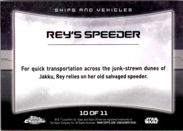 2016 Star Wars The Force Awakens Chrome Ships and Vehicles Card #10 Reys speeder Front Back Sport: Non-sports Set: 2016 Topps Chrome Star Wars The Force Awakens Ships and Vehicles Year: 2016 Item#: 10 Manufacturer: Topps Co. Grading Company: Raw Grade SetType: Insert Item Condition: Near Mint/Mint 2014 Beckett Collectibles, LLC. All Rights Reserved Powered by: Thank you for choosing Burbank Sportscards, the sports cards superstore. We offer a large selection of singles across all sports. Visit our ebay store to view all our items available. Our Shipping Policy We offer Free Standard Shipping to all Domestic customers. Options for Expedited shipping are also available at checkout. For our international customers, shipping is $9.99 for the first item, and $0.25 for each additional item. Note to all customers: To qualify for combines shipping, we ask our customers to add items into the shopping cart. Please note, we do not combine orders that are placed separately. Our Service: Generally, our turnaround is super quick as we process and send out orders same day payment is received. Stock Availability: We do our best to ensure all items are in stock; however, in case of the rare stock out, the customer will have the option for a replacement card, or we will process a refund so the order is not held up. Our Images: Many of our images are stock photos from Beckett archives. They are a representation of the actual card you would receive. If you have any questions regarding the item you're interested in, please feel free to ask (serial numbers and relic pieces may vary) Moreover, in a case of a wrong or defective photo, please notify us, so we can adjust it. Other FAQ's: -When buying multiple cards, do you top load each item? No; however, we do try to insure all items are shipped securely. If you wish to have all of your cards top loaded it is a paid service and can be arranged. Please email for more details. For other questions, please feel free to ask. Thank you.