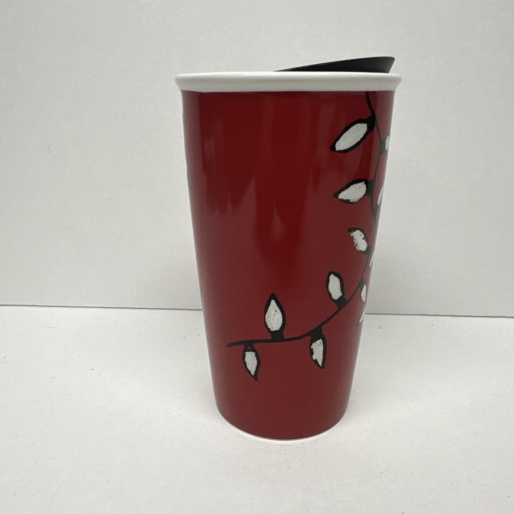 This beautiful Starbucks coffee mug is the perfect addition to any collection! Featuring a festive design with red accents and string lights, this 12 fl oz ceramic mug is perfect for enjoying your favorite hot beverage on the go during the holiday season. Made in 2016, this original piece is sure to impress any coffee or tea lover. The mug is branded with the Starbucks logo and is perfect for advertising or display purposes. Don't miss out on this unique and collectible piece!