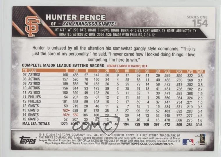 2016 Topps - [Base] - Toys R Us Purple #154 Hunter Pence - Baseball Card - Featuring the San Francisco Giants - Featuring Hunter Pence Search for more: 2016 Topps Search for more: 2016 Topps - [Base] - Toys R Us Purple View all of our Listings Auctions Buy It Now About Us Located in the beautiful Pacific Northwest, COMC (Check Out My Cards) is the world's largest consignment service for trading card singles. More than 10,000 people have used our consignment service to list over 50 million trading cards. We currently house 20 million cards, each listed for sale with front and back images of the actual card. Find out how we can help you consign your items on eBay by contacting us through eBay messaging. COMC -- "The Safe & Easy Way to Buy & Sell" Representative Image - Select Specific Item above to see image of actual item Representative Image - Select Specific Item above to see image of actual item Raw Condition for Modern Cards Unless otherwise noted, raw modern cards are listed in Near Mint-Mint condition or better. A NM-MT card appears to be Mint at first glance, but upon closer inspection, may exhibit some of the following: minor print defects (e.g. roller marks, print line, dimple), minor scratches, slight edge wear, and slight corner wear. Centering is clearly visible in the images provided and does not factor into our condition assessment. Raw Condition for Vintage Cards Unless otherwise noted, raw vintage cards are listed in Excellent condition or better. An EX card may exhibit some of the following: minor rounding of corners, surface wear, print defects, light scratches, and slight edge wear/chipping. Centering is clearly visible in the images provided and does not factor into our condition assessment. Domestic Shipping Combined shipping for multiple items is available. To receive combined shipping, please ensure all desired items are in your eBay shopping cart before proceeding to checkout. eBay limits orders to 40 items per order. We automatically combine multiple orders placed on the same day. If you place multiple orders on the same day, please contact us to request a refund of applicable shipping costs. Signature confirmation may be required on invoices over $400. Raw cards are shipped in toploaders. International Shipping COMC offers eBay's International Shipping (EIS) for international orders under $2,500* (see country exceptions below). All duties and import fees are paid at checkout; in the rare event that there are additional import fees upon delivery, these are borne by the buyer. EIS packages route through a shipping hub in Erlanger, KY before shipping to their final destination. Please note that EIS does not allow for combined shipments. The shipping rates are determined by eBay and cannot be adjusted. *Maximum sale price exceptions: Colombia, Kuwait ($2,000); Taiwan ($1,539); Chile, Costa Rica, Guatemala, Honduras, Trinidad and Tobago ($1,000); Antigua and Barbuda, Aruba, Belize, Dominica, Grenada, Philippines, Saint Kitts and Nevis, Saint Lucia, Montserrat, Turks and Caicos Islands ($500); Dominican Republic, El Salvador ($200). Please request a shipping quote through eBay messaging for orders that exceed the maximum sale price supported by eBay's International Shipping. You will be responsible for all duties and import fees for international orders shipped outside the EIS. Raw cards are shipped in toploaders. Payment COMC does not accept offers on our cards through our eBay storefront. COMC utilizes eBay’s managed payments system. If you are experiencing difficulties making a payment, please contact eBay for assistance. Return Policy Returns are only accepted on the rare occasion the item is not as described. If you are making a return, please initiate the return process through eBay so a mailing label can be provided for you. Prior to listing, our expert team carefully assessed this item to represent it accurately. Please review the description and high-definition images prior to purchasing to ensure this item meets your satisfaction. We welcome you to contact us if you have further questions about this item. Trust and Integrity COMC carefully assesses each item consigned to us to prevent fraudulent items from entering the marketplace. If you believe an item offered on COMC may be fraudulent, please contact us with details so we can investigate the issue. Items we determine are outside our supported items policy may be removed. Last Modified: 1/2/2025 8:01:55 AM PDT