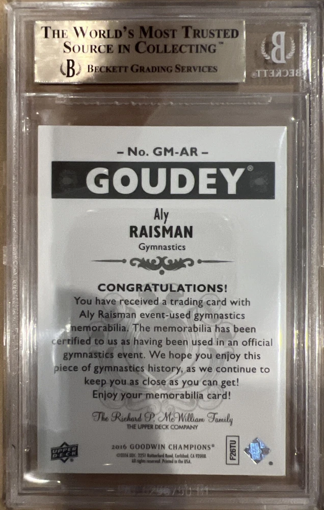 This 2016 Upper Deck Goodwin Champions Goudey Memorabilia card features Aly Raisman, a renowned athlete who has made a mark in multiple sports. The card is an original and comes from the manufacturer Upper Deck. It is a single-insert card with a card number of GM-AR and is part of the 2016 season. The card attributes include memorabilia and it is a premium variety. It is a sports trading card and is categorized under Sports Mem, Cards & Fan Shop and Trading Card Singles. The card is perfect for collectors who are looking to add an original and unique piece to their collection.