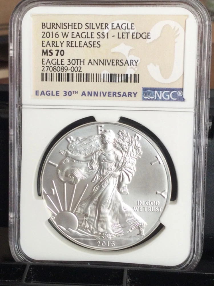 THIS IS A 2016 W BURNISHED AMERICAN SILVER EAGLE - LETTERED EDGE. EAGLE 30th ANNIVERSARY LABEL! GRADED BY NGC MS-70 WITH THE “EARLY RELEASES” DESIGNATION. (BEAUTIFUL MS-70 WITH SPECIAL “EAGLE 30th ANNIVERSARY LABEL”. CHECK OUT MY PICTURES. FLAWLESS MS70. MY PICTURES CAN BE MAGNIFIED FOR BETTER LOOK AT CONDITION. (THE COIN IN MY PICTURES IS THE EXACT COIN YOU WILL RECEIVE.) IF YOU HAVE ANY QUESTION, PLEASE FEEL FREE TO CONTACT ME. NO MIDDLE MAN ON THIS COIN. I PURCHASED DIRECTLY FROM THE U.S. MINT AND THEN FORWARDED IT TO NGC FOR GRADING. “HOLDER IS SCRATCH FREE”. A MUST FOR THE SERIOUS AMERICAN SILVER EAGLE DOLLAR COLLECTOR. GRAB THIS ONE WHILE YOU CAN. (WITH SILVER ON THE RISE, THIS MAKES A GREAT INVESTMENT.) BUY WITH CONFIDENCE AS MY 4068 FEEDBACKS SPEAK FOR THEMSELVES. QUALITY ITEMS SHIPPED PROFESSIONALLY. SHIPPING IS ONLY $4.25. PAY PAL IS THE PREFERRED METHOD OF PAYMENT.