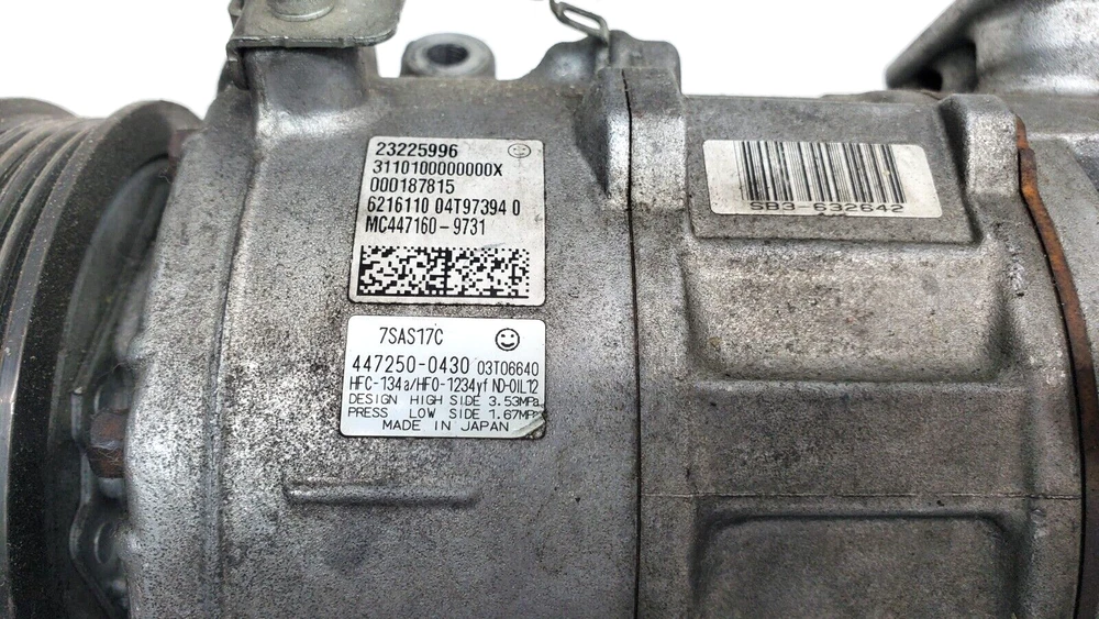 OE/OEM Part Number: 23225996, MC447160-9731, MC4471609731, MC447160 9731, 447250-0430, 4472500430, 447250 0430 Compressor Drive Type: Belt Driven Seller Notes: “The item is in good working condition” Pulley Belt Type: Multi-Groove Serpentine Type: Compressor & Clutch Assembly UPC: Does Not Apply Pulley Groove Quantity: 5 Manufacturer Part Number: 23225996, MC447160-9731, MC4471609731, MC447160 9731, 447250-0430, 4472500430, 447250 0430 Brand: Chevrolet Interchange Part Number: 23225996, MC447160-9731, MC4471609731, MC447160 9731, 447250-0430, 4472500430, 447250 0430 Superseded Part Number: 23225996, MC447160-9731, MC4471609731, MC447160 9731, 447250-0430, 4472500430, 447250 0430 Country/Region of Manufacture: Japan Material: Aluminum Manufacturer Warranty: 1 Month gtin13: Does Not Apply
