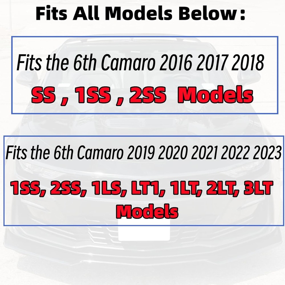 Front Bumper Lip Splitter Spoiler Compatible with 2016-2024 Chevy Gloss Black Product Details Installation Type: Screw-In Manufacturer: MUTUSAISI Model: D666 Item Weight: 3.79 pounds Package Dimensions: 31.5 x 10 x 5 inches Item model number: Front Bumper Lip Manufacturer Part Number: D666 Special Features: Breakaway Color: Gloss Black Brand: MUTUSAISI Material: ABS Plastic Vehicle Service Type: Car Auto Part Position: Front Compatible with 2016 2017 2018 2019 2020 2021 2022 2023 2024 Chevrolet Camaro SS/ 2019 2020 2021 2022 2023 2024 LT LS RS , (Won't Fit ZL1 Models) Important Notice:Please kindly check your car model and make sure the model fits in case of buying the wrong product Quality Construction:Made of high impact ABS material to be light weight and durable Need to install screws,screws included, instructions NOT included, professional installation is highly recommended.