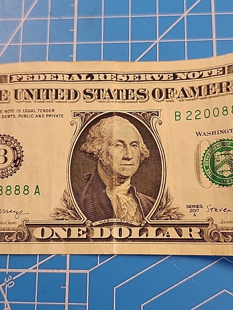 The product is a 2017 $1 Federal Reserve Note with the trinary number repeated three times, specifically #B22008888A. This banknote is circulated and originates from the United States. It is not graded or certified, making it a unique and collectible piece of American currency. I offer fast shipping with postal proof packaging. Over twenty years of selling on ebay, your satisfaction is guaranteed. Please check out my other listings for additional offers. Thank you for looking.