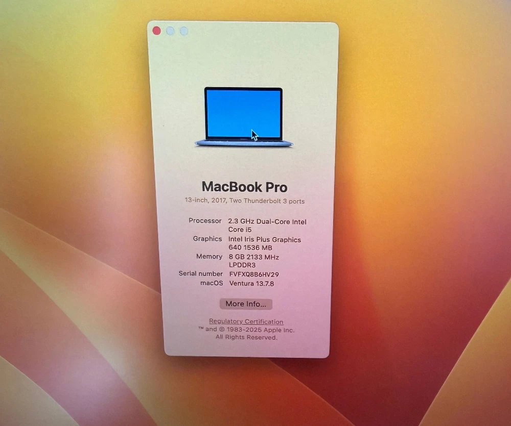 2017 MacBook Pro Bundle Item Description Up for sale is a used 2017 MacBook Pro. This is the 13 inch model, with the traditional "function keys" instead of the touch bar. The machine has visible signs of use, including scratches on the lid and bottom, and some minor wear on the keyboard keys. The machine has been tested and is fully functional, with just over 200 battery cycles on it. This MacBook Pro will ship with a fresh installation of macOS Ventura, ready to set up out of the box! If you have any questions, please do not hesitate to Contact Us via eBay Chat. We are happy to help you find the perfect machine for your needs! Specs Intel Core i5-7360U processor (2c/4t, up to 3.6GHz) 8GB 2133 MHz LPDDR3 SDRAM 256GB SSD macOS 13 Ventura Backlit Keyboard (US layout) What's Included MacBook Pro (2017, 13-inch, two Thunderbolt ports) New generic USB-C charge cable OEM Apple 30W power adapter (not the original style the machine, it's slightly smaller so it might charge a bit slower, but it is a genuine Apple charger and works perfectly) Transparent shell hard case - slight wear (minor scuffs/scratches), but not cracked Matte display screen protector - in good shape overall, and aligned correctly. Original box and purchase receipt, including some of the original documentation. I do not remember what documents were included from the factory, but I checked to see that there are at least a few things in the document holder inside the package. I have cut out personal information from the receipt, but I will include it for collectors :) Keyboard cover - fits right over the keyboard, helps to protect from dirt and dust. I used it because the keyboards on this model were recalled by Apple, and I had the one on the machine replaced once already. Condition Notes This machine has clear visible signs of use. It is not brand new, nor is it open box. It's a well-loved MacBook Pro that carried a student through undergrad. The top case was replaced by a technician with a refurbished part. The "T" key on the keyboard is a little noisier than the rest, but it has been thoroughly tested and verified to be functional. There are 204 battery charge cycles on the battery, which is original but reports "Normal" health in macOS. Third-party CoconutBattery software reports just under 85% battery health remaining. There is an imperfection in the upper left side of the display, which is very slightly visible if you stare directly at it. There is a matte screen protector applied to the display, which allows it to look a little clearer in direct sunlight, reducing glare. All MacBook Pro models released between 2016-2019 feature Apple's infamous "butterfly keyboard", which was recalled due to debris causing some of the keys to fail over time. The keyboard on this unit was already replaced, and a keyboard protector has been fitted to mitigate this issue in the future. Overall, this is a used machine and it will max out at macOS Ventura (13). Shipping Information Item will ship via UPS Ground. A tracking number will be provided for your convenience. Terms of Sale All sales are final. No warranty is offered on this item. Returns, refunds, or exchanges are not accepted.