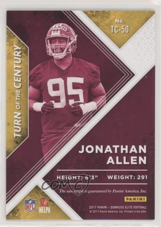 2017 Donruss Elite - Turn of the Century Autographs #TC-50 Jonathan Allen Qty Made: 99 - Rookie - Football Card - Featuring the Washington Redskins - Featuring Jonathan Allen Search for more: 2017 Donruss Elite Search for more: 2017 Donruss Elite - Turn of the Century Autographs View all of our Listings Auctions Buy It Now About Us Located in the beautiful Pacific Northwest, COMC (Check Out My Cards) is the world's largest consignment service for trading card singles. More than 10,000 people have used our consignment service to list over 50 million trading cards. We currently house 20 million cards, each listed for sale with front and back images of the actual card. Find out how we can help you consign your items on eBay by contacting us through eBay messaging. COMC -- "The Safe & Easy Way to Buy & Sell" Representative Image - Select Specific Item above to see image of actual item Representative Image - Select Specific Item above to see image of actual item Raw Condition for Modern Cards Unless otherwise noted, raw modern cards are listed in Near Mint-Mint condition or better. A NM-MT card appears to be Mint at first glance, but upon closer inspection, may exhibit some of the following: minor print defects (e.g. roller marks, print line, dimple), minor scratches, slight edge wear, and slight corner wear. Centering is clearly visible in the images provided and does not factor into our condition assessment. Raw Condition for Vintage Cards Unless otherwise noted, raw vintage cards are listed in Excellent condition or better. An EX card may exhibit some of the following: minor rounding of corners, surface wear, print defects, light scratches, and slight edge wear/chipping. Centering is clearly visible in the images provided and does not factor into our condition assessment. Domestic Shipping Combined shipping for multiple items is available. To receive combined shipping, please ensure all desired items are in your eBay shopping cart before proceeding to checkout. eBay limits orders to 40 items per order. We automatically combine multiple orders placed on the same day. If you place multiple orders on the same day, please contact us to request a refund of applicable shipping costs. Signature confirmation may be required on invoices over $400. Raw cards are shipped in toploaders. International Shipping COMC offers eBay's International Shipping (EIS) for international orders under $2,500* (see country exceptions below). All duties and import fees are paid at checkout; in the rare event that there are additional import fees upon delivery, these are borne by the buyer. EIS packages route through a shipping hub in Erlanger, KY before shipping to their final destination. Please note that EIS does not allow for combined shipments. The shipping rates are determined by eBay and cannot be adjusted. *Maximum sale price exceptions: Colombia, Kuwait ($2,000); Taiwan ($1,539); Chile, Costa Rica, Guatemala, Honduras, Trinidad and Tobago ($1,000); Antigua and Barbuda, Aruba, Belize, Dominica, Grenada, Philippines, Saint Kitts and Nevis, Saint Lucia, Montserrat, Turks and Caicos Islands ($500); Dominican Republic, El Salvador ($200). Please request a shipping quote through eBay messaging for orders that exceed the maximum sale price supported by eBay's International Shipping. You will be responsible for all duties and import fees for international orders shipped outside the EIS. Raw cards are shipped in toploaders. Payment COMC does not accept offers on our cards through our eBay storefront. COMC utilizes eBay’s managed payments system. If you are experiencing difficulties making a payment, please contact eBay for assistance. Return Policy Returns are only accepted on the rare occasion the item is not as described. If you are making a return, please initiate the return process through eBay so a mailing label can be provided for you. Prior to listing, our expert team carefully assessed this item to represent it accurately. Please review the description and high-definition images prior to purchasing to ensure this item meets your satisfaction. We welcome you to contact us if you have further questions about this item. Trust and Integrity COMC carefully assesses each item consigned to us to prevent fraudulent items from entering the marketplace. If you believe an item offered on COMC may be fraudulent, please contact us with details so we can investigate the issue. Items we determine are outside our supported items policy may be removed. Last Modified: 12/30/2024 7:52:52 PM PDT