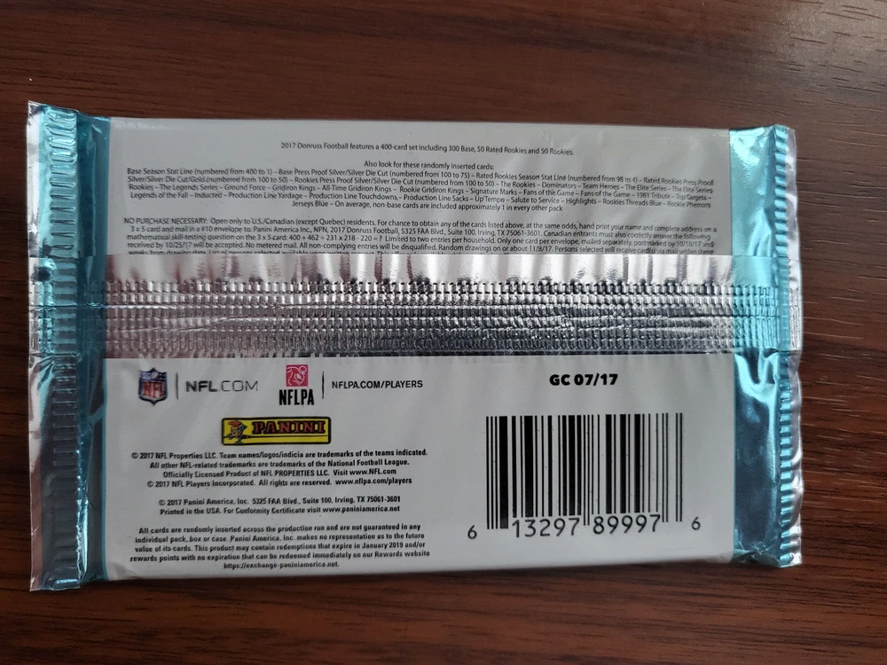 Factory sealed packs. Full Checklist: Base 1 J.J. Watt - Houston Texans 2 Josh McCown - New York Jets 3 Cameron Meredith - Chicago Bears 4 Richard Sherman - Seattle Seahawks 5 C.J. Anderson - Denver Broncos 6 Dan Fouts - San Diego Chargers 7 Ted Ginn Jr. - New Orleans Saints 8 Cody Kessler - Cleveland Browns 9 Mohamed Sanu - Atlanta Falcons 10 Eli Manning - New York Giants 11 Steve Smith Sr. - Carolina Panthers 12 DeAndre Washington - Oakland Raiders 13 Golden Tate III - Detroit Lions 14 Ryan Tannehill - Miami Dolphins 15 Jalen Ramsey - Jacksonville Jaguars 16 Michael Thomas - New Orleans Saints 17 Tedy Bruschi - New England Patriots 18 Antonio Brown - Pittsburgh Steelers 19 Cameron Brate - Tampa Bay Buccaneers 20 A.J. Green - Cincinnati Bengals 21 Larry Fitzgerald - Arizona Cardinals 22 Joe Flacco - Baltimore Ravens 23 Phil Simms - New York Giants 24 Lorenzo Alexander - Buffalo Bills 25 Rob Gronkowski - New England Patriots 26 Joe Haden - Cleveland Browns 27 Martellus Bennett - Green Bay Packers 28 Haloti Ngata - Detroit Lions 29 Charles Sims - Tampa Bay Buccaneers 30 Desmond Trufant - Atlanta Falcons 31 Calvin Johnson - Detroit Lions 32 Bruce Smith - Buffalo Bills 33 Julian Edelman - New England Patriots 34 Ben Roethlisberger - Pittsburgh Steelers 35 Cam Newton - Carolina Panthers 36 Josh Norman - Washington Redskins 37 Tyrann Mathieu - Arizona Cardinals 38 Demaryius Thomas - Denver Broncos 39 Dak Prescott - Dallas Cowboys 40 Frank Gore - Indianapolis Colts 41 Theo Riddick - Detroit Lions 42 Jason Pierre-Paul - New York Giants 43 Terrell Suggs - Baltimore Ravens 44 Allen Robinson - Jacksonville Jaguars 45 Jared Goff - Los Angeles Rams 46 Xavier Rhodes - Minnesota Vikings 47 Greg Olsen - Carolina Panthers 48 Julio Jones - Atlanta Falcons 49 Kwon Alexander - Tampa Bay Buccaneers 50 Leonard Williams - New York Jets 51 Robert Woods - Los Angeles Rams 52 Jurrell Casey - Tennessee Titans 53 Ryan Shazier - Pittsburgh Steelers 54 DeForest Buckner - San Francisco 49ers 55 Eric Ebron - Detroit Lions 56 Hunter Henry - Los Angeles Chargers 57 Marvin Jones Jr. - Detroit Lions 58 Geno Atkins - Cincinnati Bengals 59 Aqib Talib - Denver Broncos 60 Randy Moss - Minnesota Vikings 61 Chris Hogan - New England Patriots 62 Alshon Jeffery - Philadelphia Eagles 63 Will Fuller V - Houston Texans 64 Tom Brady - New England Patriots 65 Terrelle Pryor Sr. - Washington Redskins 66 Chris Harris - Denver Broncos 67 Carson Palmer - Arizona Cardinals 68 Sam Bradford - Minnesota Vikings 69 Danny Amendola - New England Patriots 70 Aaron Donald - Los Angeles Rams 71 Robby Anderson - New York Jets 72 Ty Montgomery - Green Bay Packers 73 Kyle Long - Chicago Bears 74 Giovani Bernard - Cincinnati Bengals 75 Janoris Jenkins - New York Giants 76 David Johnson - Arizona Cardinals 77 Davante Adams - Green Bay Packers 78 Jamie Collins - Cleveland Browns 79 Carson Wentz - Philadelphia Eagles 80 Mark Ingram - New Orleans Saints 81 Kenny Britt - Cleveland Browns 82 Jeremy Hill - Cincinnati Bengals 83 Eric Berry - Kansas City Chiefs 84 Navorro Bowman - San Francisco 49ers 85 Cameron Wake - Miami Dolphins 86 Robert Kelley - Washington Redskins 87 Matt Forte - New York Jets 88 Marcell Dareus - Buffalo Bills 89 Carlos Dunlap - Cincinnati Bengals 90 Terrance Williams - Dallas Cowboys 91 Quincy Enunwa - New York Jets 92 Jimmy Graham - Seattle Seahawks 93 Darren Sproles - Philadelphia Eagles 94 Jonathan Stewart - Carolina Panthers 95 Patrick Peterson - Arizona Cardinals 96 Troy Aikman - Dallas Cowboys 97 Bilal Powell - New York Jets 98 Christian Okoye - Kansas City Chiefs 99 Terrance West - Baltimore Ravens 100 Jordan Howard - Chicago Bears 101 Willie Roaf - New Orleans Saints 102 Cordarrelle Patterson - Oakland Raiders 103 Clay Matthews - Green Bay Packers 104 Keenan Allen - Los Angeles Chargers 105 Jay Ajayi - Miami Dolphins 106 J.J. Nelson - Arizona Cardinals 107 Vic Beasley Jr. - Atlanta Falcons 108 Marquise Goodwin - San Francisco 49ers 109 Corey Coleman - Cleveland Browns 110 Tevin Coleman - Atlanta Falcons 111 Adam Thielen - Minnesota Vikings 112 Latavius Murray - Minnesota Vikings 113 Pierre Garcon - San Francisco 49ers 114 Ezekiel Elliott - Dallas Cowboys 115 Emmanuel Sanders - Denver Broncos 116 Matthew Stafford - Detroit Lions 117 Landon Collins - New York Giants 118 Paul Hornung - Green Bay Packers 119 Russell Wilson - Seattle Seahawks 120 Devonta Freeman - Atlanta Falcons 121 Ha Ha Clinton-Dix - Green Bay Packers 122 Zach Ertz - Philadelphia Eagles 123 Deion Sanders - Atlanta Falcons 124 Spencer Ware - Kansas City Chiefs 125 Jeremy Kerley - San Francisco 49ers 126 Kamar Aiken - Indianapolis Colts 127 Markus Wheaton - Chicago Bears 128 Tyrell Williams - Los Angeles Chargers 129 Travis Kelce - Kansas City Chiefs 130 Luke Kuechly - Carolina Panthers 131 Coby Fleener - New Orleans Saints 132 Kevin White - Chicago Bears 133 Derek Carr - Oakland Raiders 134 Torrey Smith - Philadelphia Eagles 135 Gerald McCoy - Tampa Bay Buccaneers 136 Vontae Davis - Indianapolis Colts 137 Thomas Davis - Carolina Panthers 138 Tavon Austin - Los Angeles Rams 139 Jameis Winston - Tampa Bay Buccaneers 140 Tajae Sharpe - Tennessee Titans 141 Trevor Siemian - Denver Broncos 142 Jordan Matthews - Philadelphia Eagles 143 T.J. Yeldon - Jacksonville Jaguars 144 Dan Marino - Miami Dolphins 145 Brandon LaFell - Cincinnati Bengals 146 Jarvis Landry - Miami Dolphins 147 John Kuhn - New Orleans Saints 148 Charles Clay - Buffalo Bills 149 Melvin Gordon - Los Angeles Chargers 150 Cameron Jordan - New Orleans Saints 151 Devin Funchess - Carolina Panthers 152 Amari Cooper - Oakland Raiders 153 DeSean Jackson - Tampa Bay Buccaneers 154 Joey Bosa - Los Angeles Chargers 155 Thomas Rawls - Seattle Seahawks 156 Jesse James - Pittsburgh Steelers 157 Marqise Lee - Jacksonville Jaguars 158 LeSean McCoy - Buffalo Bills 159 Julius Thomas - Miami Dolphins 160 Andrew Luck - Indianapolis Colts 161 Jordan Reed - Washington Redskins 162 Jim Zorn - Seattle Seahawks 163 Ed Reed - Bal