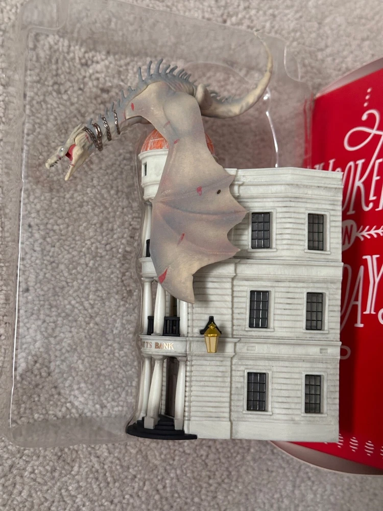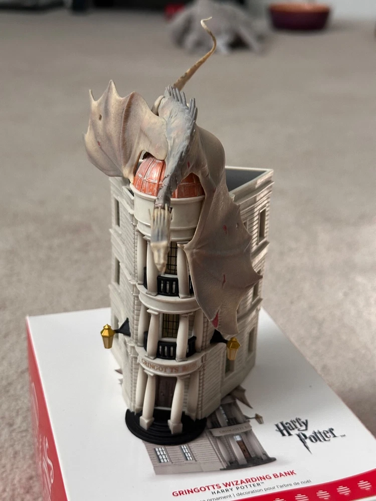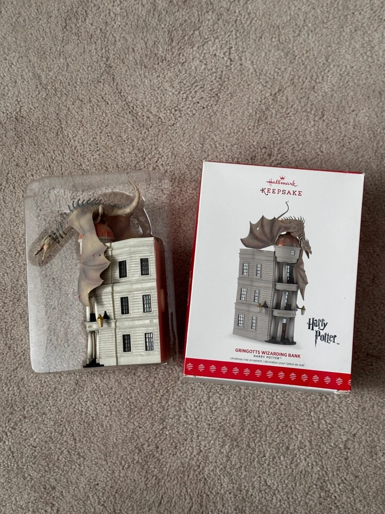 Rare official Christmas tree ornament for any Harry Potter fan! Crafted for the ultimate Harry Potter enthusiast, this 2017 Hallmark Keepsake Ornament brings the awe of Gringotts Wizarding Bank to life. Featuring a vibrant, multicolor design, this medium-sized ornament captures the essence of the beloved franchise with intricate detailing that showcases a dragon-filled hall in the famous bank. Ideal for anyone aged 5 to 12 years, it's a magical addition to any Christmas tree, bringing a touch of Hogwarts to your holiday decor. The plastic ornament, measuring 4 inches in height and weighing 7.2 oz, is designed to be hung, adding a mystical charm to your seasonal celebrations. Box has some wear from storage. Ornament comes in original plastic packaging, never used, stored with care in a smoke-free home. Free shipping!
