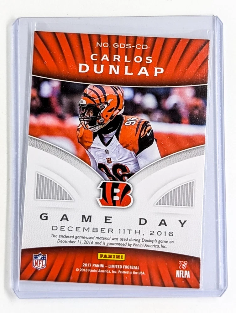 2017 Limited Game Day Swatches Prime #GDS-CD Carlos Dunlap #10/25 Bengals Game Worn on 12/11/16 vs. Cleveland Browns PLEASE NOTE: You are bidding on and will be receiving the EXACT card in the listing and photo—I do not use stock photos. Please use photos to judge for yourself and to ultimately determine the condition before you buy. FREE SHIPPING via eBay Standard Envelope .