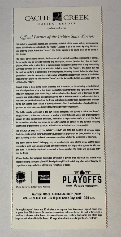 June 4, 2017 Golden State Warriors 132 - Cleveland Cavaliers 113 KD 33pts 13reb 6ast Lebron 29pts 11reb 14ast Steph Curry 32pts 10reb 11ast LeBron & Steph BOTH triple doubles Lebron averaged a Triple Double in this series Durant was MVP Stub is NM+ to MINT exact one pictured Large stub 3in X 7.25in