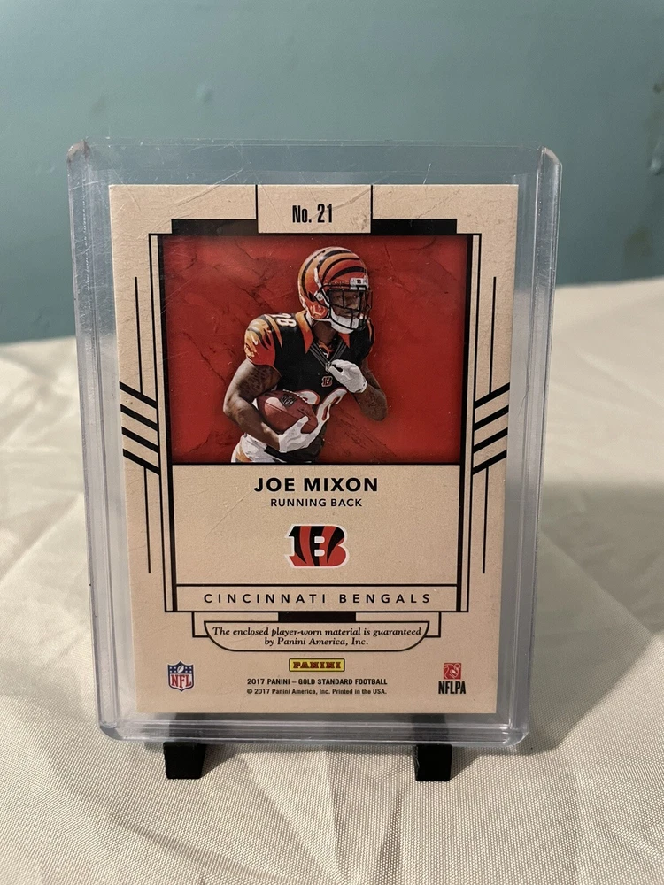 This 2017 Panini Gold Standard sports trading card features Joe Mixon of the Cincinnati Bengals. The card is part of the Newly Minted Memorabilia insert set and is numbered 21 out of 199. It is a rookie card and also includes memorabilia from the player. The card is perfect for collectors who are fans of the National Football League (NFL) and football in general. It is a great addition to any sports trading card collection and is sure to impress.