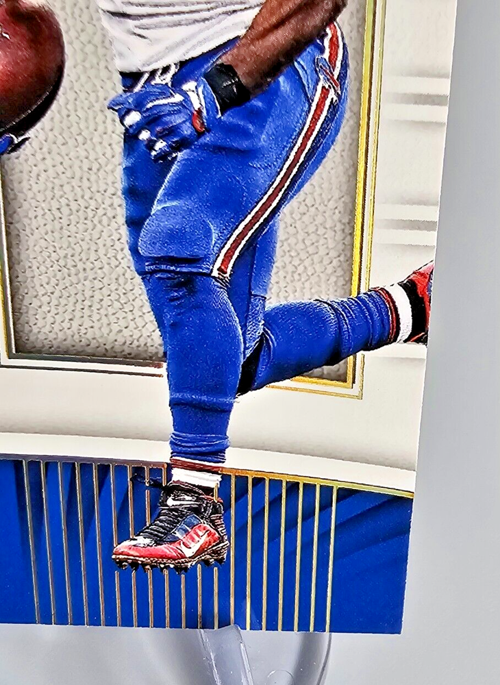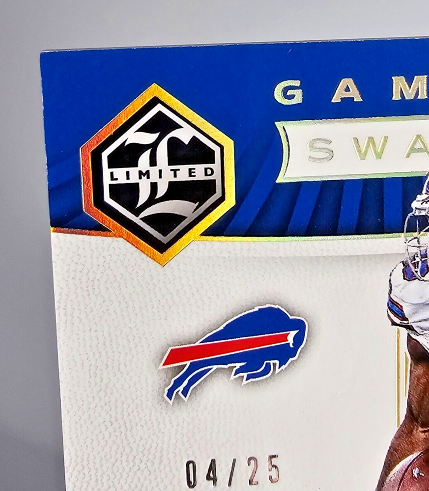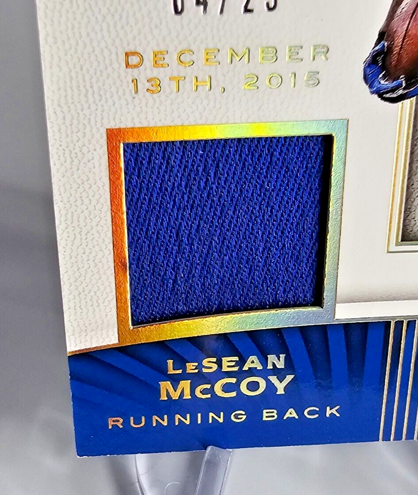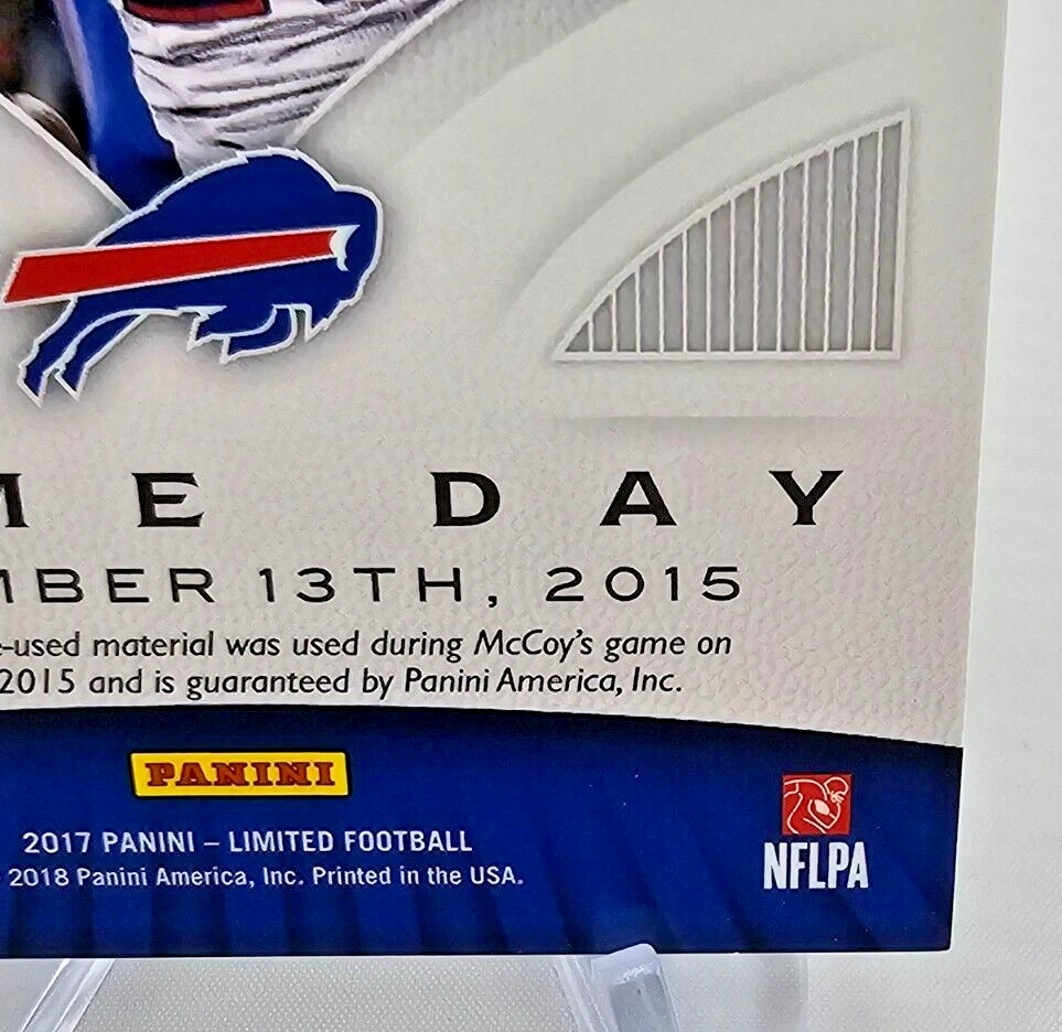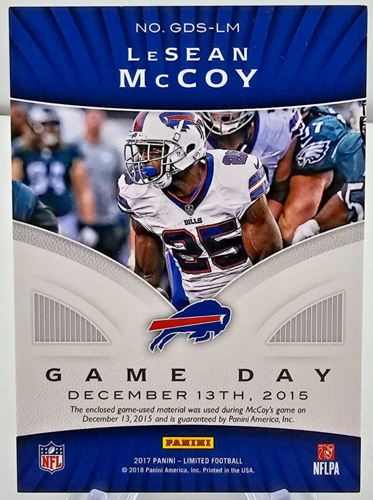 This 2017 Panini Limited Game Day Swatches Prime #GDS-LM LeSean McCoy card features a game-worn jersey piece from McCoy’s performance on December 13, 2015 , against the Philadelphia Eagles. The card is serial numbered 04/25 , highlighting its rarity, as Prime cards are serial numbered to no more than 25 , making this an exceptional addition to any collection. Card Name : 2017 Panini Limited LeSean McCoy Game Day Swatches Prime Card Number : #GDS-LM 04/25 Manufacturer : Panini Insert Name : Game Day Swatches Features : Game-Worn Jersey (12/13/2015 vs. Eagles) This rare and stunning card celebrates McCoy’s contributions to the NFL and is a true piece of football history. A must-have for any serious collector of LeSean McCoy or Buffalo Bills memorabilia. Don't miss out on this limited edition card from Panini’s prestigious series! All shipments packaged in penny sleeves, top-loaders or one touch, styrofoam sheets, and multiple bubble mailers! Please take a look at the photos attached to this listing when determining the condition of this item. If you have any questions, please don't hesitate to reach out to us! Thanks for looking!