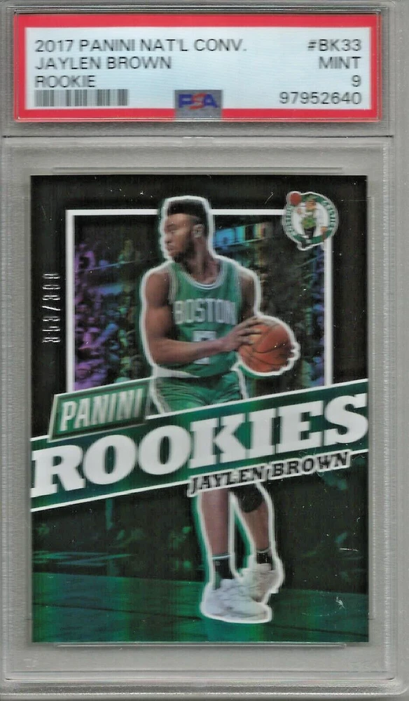 Additional Description:Rookies - Jaylen BrownSet:2017 Panini National ConventionFeatures:Serial Numbered, Base SetSport:BasketballSeries:Panini National ConventionTeam:Boston CelticsSubset:RookiesSeason:2017Print Run:399Player/Athlete:Jaylen BrownCard Number:BK33League:National Basketball Association (NBA)brand:PaniniManufacturer:Panini