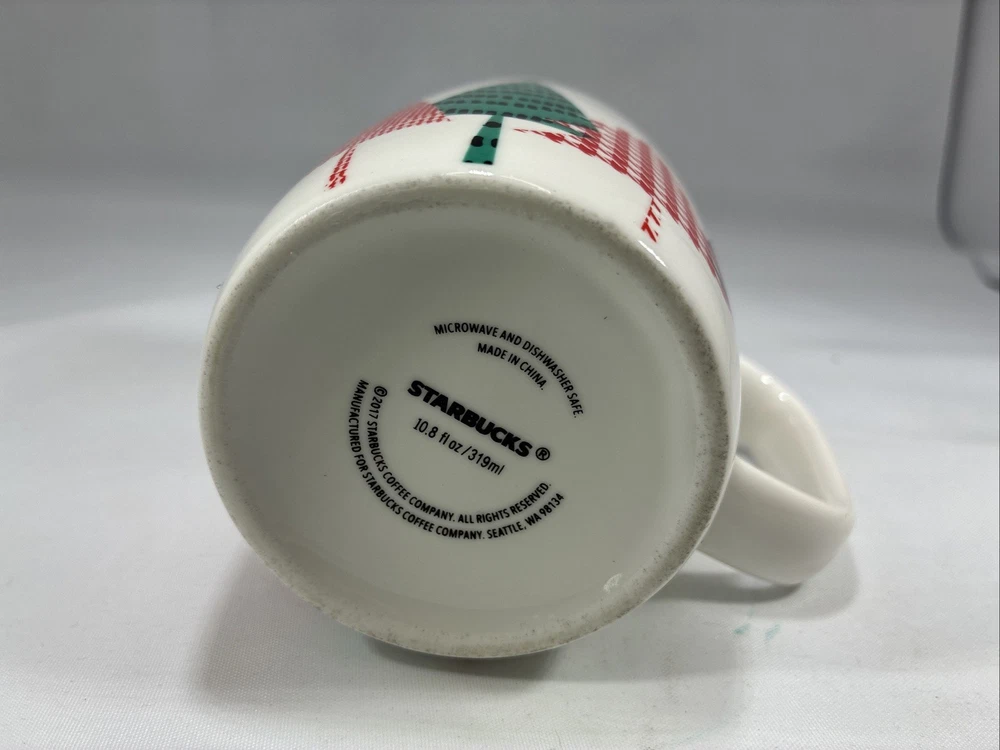 The 2017 Starbucks Ceramic Christmas Coffee Mug is a collectible advertising item featuring a festive holiday theme. Made in China, this original piece showcases a classic white color with Christmas trees and other holiday motifs. Perfect for coffee and tea enthusiasts, this 12 oz. mug is a perfect addition to any Starbucks memorabilia collection, celebrating the brand's iconic role in the food and beverage industry.