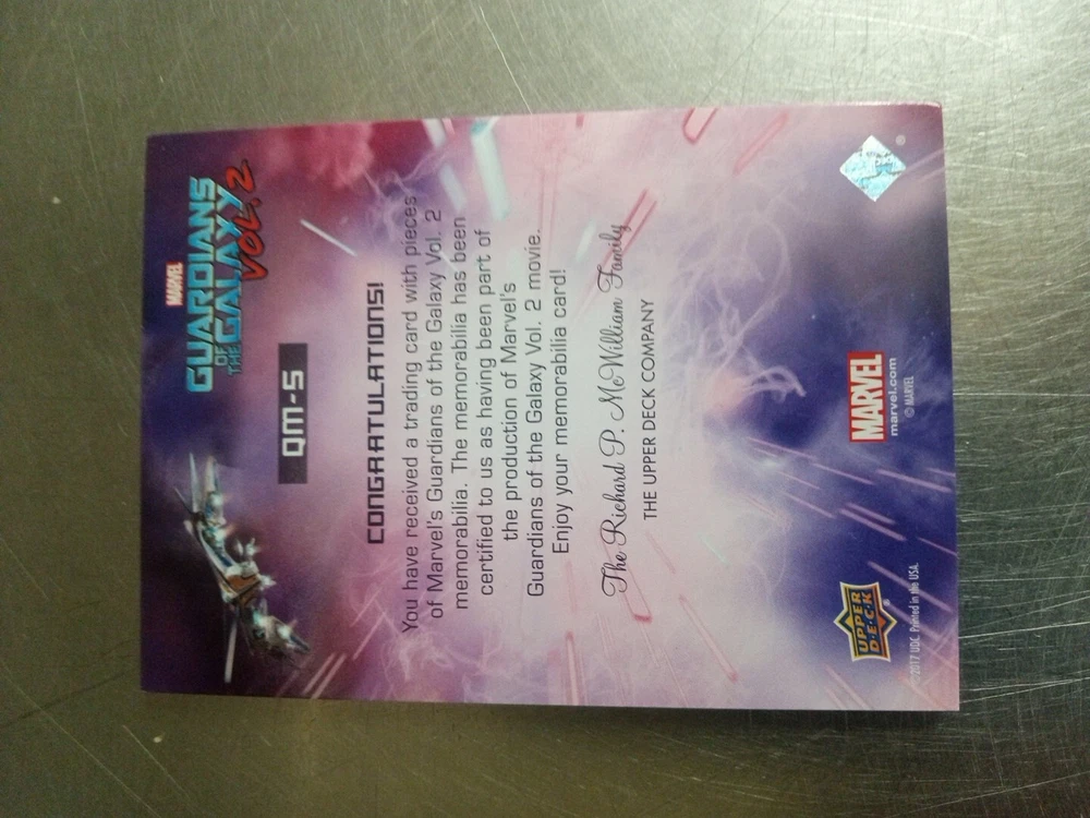 Year: 2017 Product: Single-Insert Year Manufactured: 2017 Sport: Marvel Player/Athlete: Yondu Manufacturer: Upper Deck Card Manufacturer: Upper Deck Card Number: QM-5 Character: Starlord, Gamora, Drax, Rocket Raccoon Franchise: N/A Original/Reprint: Original Season: 2017 Set: 2017 Upper Deck Marvel Guardians of the Galaxy Volume 2 - Galacti Card Attributes: Memorabilia Player: Yondu Parallel/Variety: [None] Team: N/A Athlete: Yondu Features: Insert Type: Non-Sport Trading Card