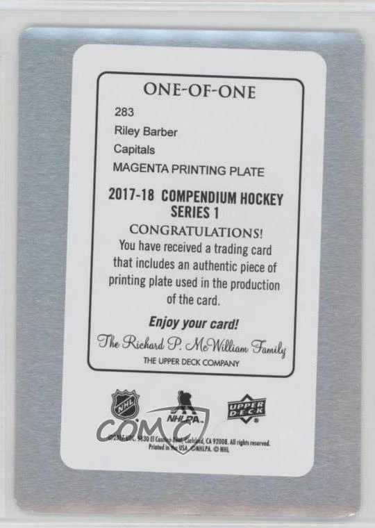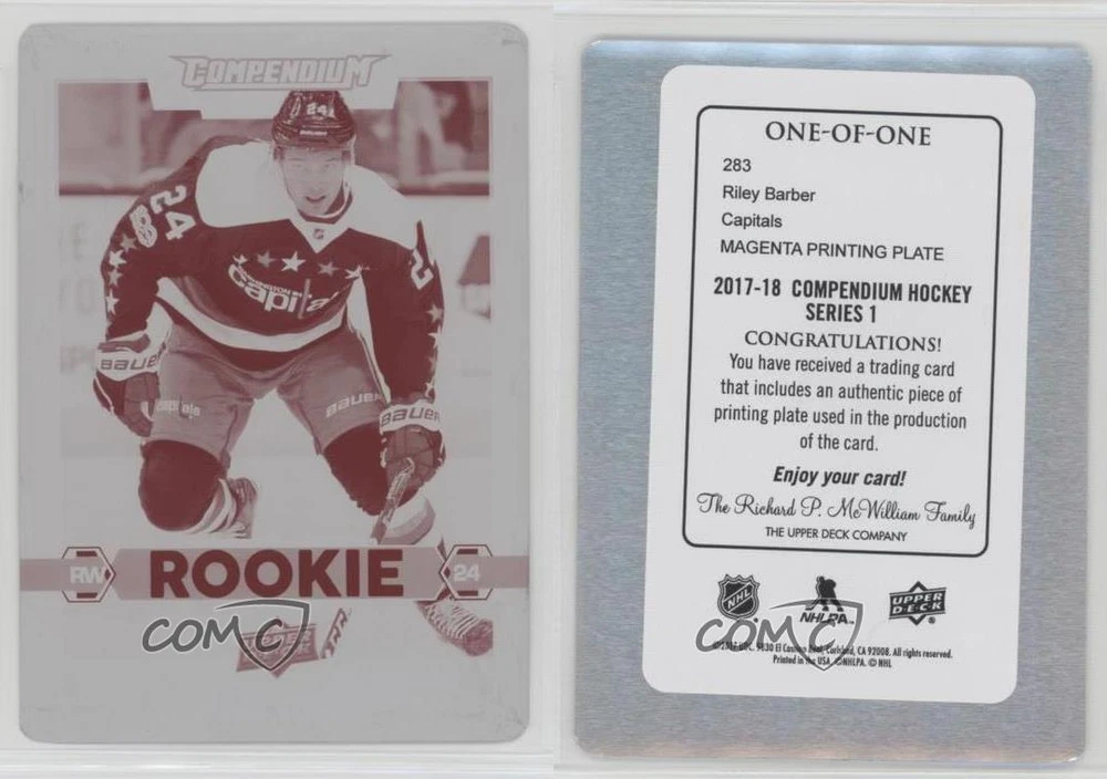 2017-18 Upper Deck Compendium - [Base] - Printing Plate Magenta #283 Rookies - Riley Barber Serial #1/1 COMC Item: 45017964 - RC (Rookie Card) - Ice Hockey Card - Featuring the Washington Capitals - Featuring Riley Barber Search for more: 2017-18 Upper Deck Compendium Search for more: 2017-18 Upper Deck Compendium - [Base] - Printing Plate Magenta View all of our Listings Auctions Buy It Now About Us Located in the beautiful Pacific Northwest, COMC (Check Out My Cards) is the world's largest consignment service for trading card singles. More than 10,000 people have used our consignment service to list over 50 million trading cards. We currently house 20 million cards, each listed for sale with front and back images of the actual card. Find out how we can help you consign your items on eBay by contacting us through eBay messaging. COMC -- "The Safe & Easy Way to Buy & Sell" Raw Condition for Modern Cards Unless otherwise noted, raw modern cards are listed in Near Mint-Mint condition or better. A NM-MT card appears to be Mint at first glance, but upon closer inspection, may exhibit some of the following: minor print defects (e.g. roller marks, print line, dimple), minor scratches, slight edge wear, and slight corner wear. Centering is clearly visible in the images provided and does not factor into our condition assessment. Raw Condition for Vintage Cards Unless otherwise noted, raw vintage cards are listed in Excellent condition or better. An EX card may exhibit some of the following: minor rounding of corners, surface wear, print defects, light scratches, and slight edge wear/chipping. Centering is clearly visible in the images provided and does not factor into our condition assessment. Domestic Shipping Combined shipping for multiple items is available. To receive combined shipping, please ensure all desired items are in your eBay shopping cart before proceeding to checkout. eBay limits orders to 40 items per order. We automatically combine multiple orders placed on the same day. If you place multiple orders on the same day, please contact us to request a refund of applicable shipping costs. Signature confirmation may be required on invoices over $400. Raw cards are shipped in toploaders. International Shipping COMC offers eBay's International Shipping (EIS) for international orders under $2,500* (see country exceptions below). All duties and import fees are paid at checkout; in the rare event that there are additional import fees upon delivery, these are borne by the buyer. EIS packages route through a shipping hub in Erlanger, KY before shipping to their final destination. Please note that EIS does not allow for combined shipments. The shipping rates are determined by eBay and cannot be adjusted. *Maximum sale price exceptions: Colombia, Kuwait ($2,000); Taiwan ($1,539); Chile, Costa Rica, Guatemala, Honduras, Trinidad and Tobago ($1,000); Antigua and Barbuda, Aruba, Belize, Dominica, Grenada, Philippines, Saint Kitts and Nevis, Saint Lucia, Montserrat, Turks and Caicos Islands ($500); Dominican Republic, El Salvador ($200). Please request a shipping quote through eBay messaging for orders that exceed the maximum sale price supported by eBay's International Shipping. You will be responsible for all duties and import fees for international orders shipped outside the EIS. Raw cards are shipped in toploaders. Payment COMC does not accept offers on our cards through our eBay storefront. COMC utilizes eBay’s managed payments system. If you are experiencing difficulties making a payment, please contact eBay for assistance. Return Policy Returns are only accepted on the rare occasion the item is not as described. If you are making a return, please initiate the return process through eBay so a mailing label can be provided for you. Prior to listing, our expert team carefully assessed this item to represent it accurately. Please review the description and high-definition images prior to purchasing to ensure this item meets your satisfaction. We welcome you to contact us if you have further questions about this item. Trust and Integrity COMC carefully assesses each item consigned to us to prevent fraudulent items from entering the marketplace. If you believe an item offered on COMC may be fraudulent, please contact us with details so we can investigate the issue. Items we determine are outside our supported items policy may be removed. Last Modified: 10/20/2024 4:36:21 AM PDT