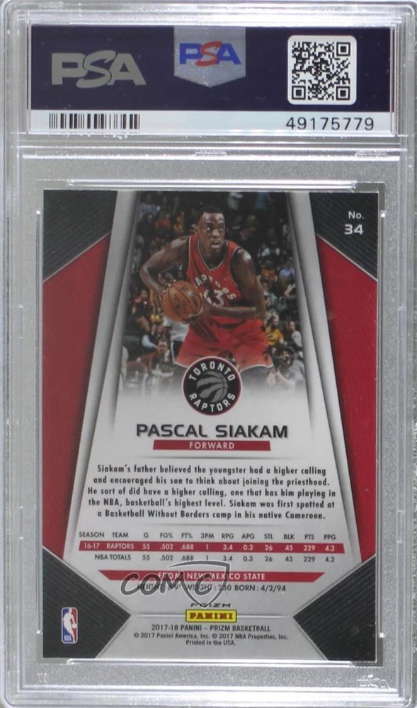 2017-18 Panini Prizm - [Base] - Red White & Blue Prizm #34 Pascal Siakam Graded PSA 9 MINT - Basketball Card - Featuring the Toronto Raptors - Featuring Pascal Siakam Search for more: 2017-18 Panini Prizm Search for more: 2017-18 Panini Prizm - [Base] - Red White & Blue Prizm View all of our Listings Auctions Buy It Now About Us Located in the beautiful Pacific Northwest, COMC (Check Out My Cards) is the world's largest consignment service for trading card singles. More than 10,000 people have used our consignment service to list over 50 million trading cards. We currently house 20 million cards, each listed for sale with front and back images of the actual card. Find out how we can help you consign your items on eBay by contacting us through eBay messaging. COMC -- "The Safe & Easy Way to Buy & Sell" Representative Image - Select Specific Item above to see image of actual item Representative Image - Select Specific Item above to see image of actual item Raw Condition for Modern Cards Unless otherwise noted, raw modern cards are listed in Near Mint-Mint condition or better. A NM-MT card appears to be Mint at first glance, but upon closer inspection, may exhibit some of the following: minor print defects (e.g. roller marks, print line, dimple), minor scratches, slight edge wear, and slight corner wear. Centering is clearly visible in the images provided and does not factor into our condition assessment. Raw Condition for Vintage Cards Unless otherwise noted, raw vintage cards are listed in Excellent condition or better. An EX card may exhibit some of the following: minor rounding of corners, surface wear, print defects, light scratches, and slight edge wear/chipping. Centering is clearly visible in the images provided and does not factor into our condition assessment. Domestic Shipping Combined shipping for multiple items is available. To receive combined shipping, please ensure all desired items are in your eBay shopping cart before proceeding to checkout. eBay limits orders to 40 items per order. We automatically combine multiple orders placed on the same day. If you place multiple orders on the same day, please contact us to request a refund of applicable shipping costs. Signature confirmation may be required on invoices over $400. Raw cards are shipped in toploaders. International Shipping COMC offers eBay's International Shipping (EIS) for international orders under $2,500* (see country exceptions below). All duties and import fees are paid at checkout; in the rare event that there are additional import fees upon delivery, these are borne by the buyer. EIS packages route through a shipping hub in Erlanger, KY before shipping to their final destination. Please note that EIS does not allow for combined shipments. The shipping rates are determined by eBay and cannot be adjusted. *Maximum sale price exceptions: Colombia, Kuwait ($2,000); Taiwan ($1,539); Chile, Costa Rica, Guatemala, Honduras, Trinidad and Tobago ($1,000); Antigua and Barbuda, Aruba, Belize, Dominica, Grenada, Philippines, Saint Kitts and Nevis, Saint Lucia, Montserrat, Turks and Caicos Islands ($500); Dominican Republic, El Salvador ($200). Please request a shipping quote through eBay messaging for orders that exceed the maximum sale price supported by eBay's International Shipping. You will be responsible for all duties and import fees for international orders shipped outside the EIS. Raw cards are shipped in toploaders. Payment COMC does not accept offers on our cards through our eBay storefront. COMC utilizes eBay’s managed payments system. If you are experiencing difficulties making a payment, please contact eBay for assistance. Return Policy Returns are only accepted on the rare occasion the item is not as described. If you are making a return, please initiate the return process through eBay so a mailing label can be provided for you. Prior to listing, our expert team carefully assessed this item to represent it accurately. Please review the description and high-definition images prior to purchasing to ensure this item meets your satisfaction. We welcome you to contact us if you have further questions about this item. Trust and Integrity COMC carefully assesses each item consigned to us to prevent fraudulent items from entering the marketplace. If you believe an item offered on COMC may be fraudulent, please contact us with details so we can investigate the issue. Items we determine are outside our supported items policy may be removed. Last Modified: 12/30/2024 4:02:39 PM PDT