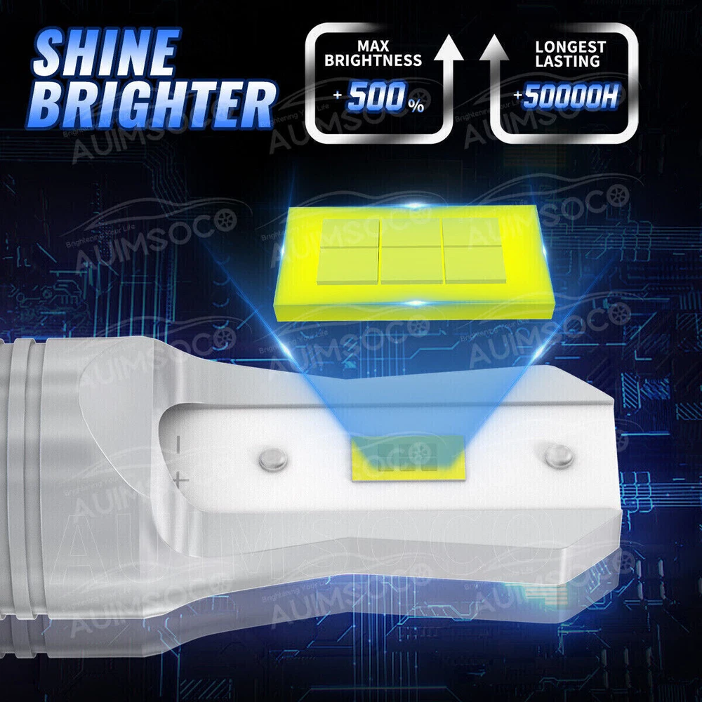 Package Content: 2x H11/H8 Low Beam LED Headlights Bulbs 2x 9005/HB3 High Beam LED Headlights Bulbs 2x H11 Fog Light Bulbs ● 300% Brighter: Equipped with high luminous efficacy CSP chips.300% Brighter than standard halogen. Our LED headlight bulbs ensure the clarity of vision allows drivers easy to react to sudden movement. Effectively illuminate wildlife, falling rocks and obstacles. Huge improvement for road safety. ● Ideal Beam Pattern: AUIMSOCO LED bulb features 0.12inch slim led chips distance design that almost can emit 360 degrees illumination angle. Super focused beam pattern as stock halogen lamp, no dark spots or glare to oncoming drivers, avoiding scattered light problem to ensure safety. ● 50,000 Hours Lifespan: Efficient cooling system speed up heat dissipation to ensure LED headlight bulbs superior performance, lifespan up to 50,000 hours. ● 10 Mins Quick Install: Built-in driver and non-polarity plug, 1:1 same filament position as stock halogen. LED headlight small size design for higher compatibility in factory housing. No modification required,easy installation in 10 mins. Just Plug & play! ● Superb Performance: CANbus ready and fits 99% vehicles without issue. Integrated with CSP chip, no radio interference. IP67 waterproof feature makes it work perfectly on any extreme weather, like rainy day, snowy day, foggy day, hazy weather,etc. ● Unique Fanless Design: Our led bulbs, without fans at the bottom, provide you a quiet driving environment and do not affect the heat dissipation of the lights. Specifications: --Plug type: 9005/HB3+H11/H8+H11 --Condition: Brand New / Never Used --Voltage: DC 9-32V ( Fit 12V,24V Vehicle ) --Color Temperature : 6000K White --IP Rate: IP67 --LED type:CSP LEDs --Color Temperature: 6000K-6500K White --Beam Angle: 360° --Operating Temperature: -40 - +105°C --Lifespan: 50,000+ working hours --Number of Bulbs: 6 --To Fit: Headlights Kit + Fog Light --Placement on Vehicle: Left,Right,Front --Material: Aluminum alloy --Application: Headlight (High + Low Beam Head Lights )+Fog Light Bulbs