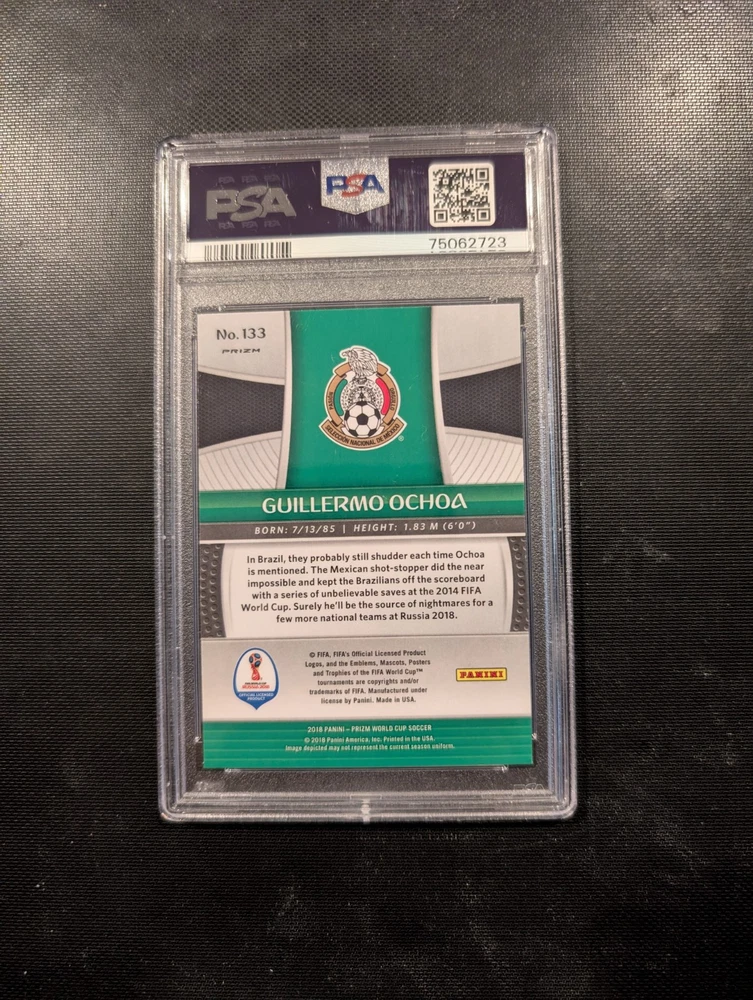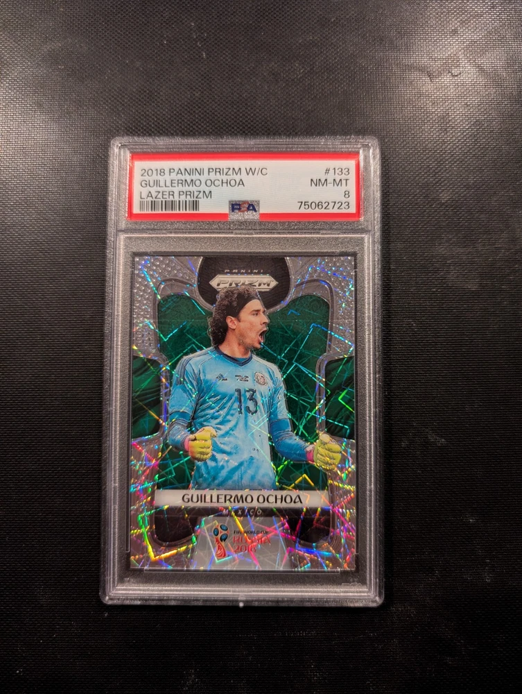 Capture a piece of soccer history with the 2018 Panini World Cup Legend Guillermo Ochoa Lazer Prizm card. This trading card celebrates the talent of the famous Mexican player, known for his impressive performances in the FIFA World Cup. The Lazer Prizm parallel adds an eye-catching shimmer, making it a standout in any collection. As a part of the esteemed 2018 Panini set, this card is a must-have for soccer enthusiasts and sports memorabilia collectors. Whether you're a fan of Ochoa, Mexico's national team, or the sport itself, this card is a significant addition, capturing the spirit of the game and the legacy of a World Cup hero.