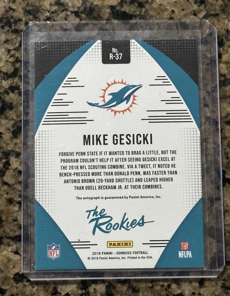 Year Manufactured: 2018 Card Size: Standard Signed By: MIKE GESICKI Season: 2018 Vintage: No Sport: Football gtin13: Does not apply UPC: Does not apply Set: 2018 Panini Donruss Type: Sports Trading Card Player/Athlete: Mike Gesicki Card Number: 37 Country/Region of Manufacture: United States League: National Football League (NFL) Features: Rookie Material: Card Stock Autographed: Yes Team: Miami Dolphins Autograph Format: Label or Sticker Manufacturer: Panini