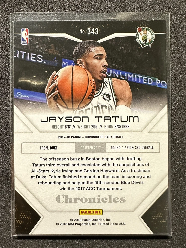 Features: Rookie, Base Set Team: Boston Celtics Player/Athlete: Jayson Tatum Card Number: 343 Sport: Basketball Set: 2018 Panini Chronicles Type: Sports Trading Card Season: 2018 League: National Basketball Association (NBA) Manufacturer: Panini