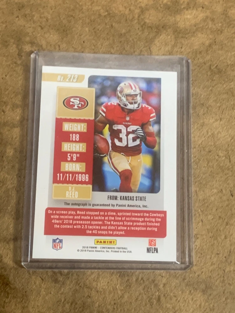 This is a nice example of a 2018 Panini Contenders #213 D.J. Reed Rookie Playoff Ticket.Other important information about this card: AU,SNIn 2018 D.J. Reed played for the San Francisco 49ers.Please check out our other listings for more great cards. Shipping can be combined! First card is $1.25 - each additional card is $0.50. Up to 2 cards will be toploaded, additional cards won/paid for will be in a penny sleeve. Thank you for your business!