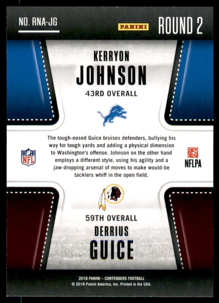 Brand: Panini Contenders Sport: Football Card Manufacturer: Panini Group Team: Detroit Lions, Washington Redskins Item Condition: Near Mint/Mint Grade: Near Mint/Mint Player: Derrius Guice, Kerryon Johnson Original/Reprint: Original Period: Modern (1970-Now) Graded: No Year: 2018 Product: Single