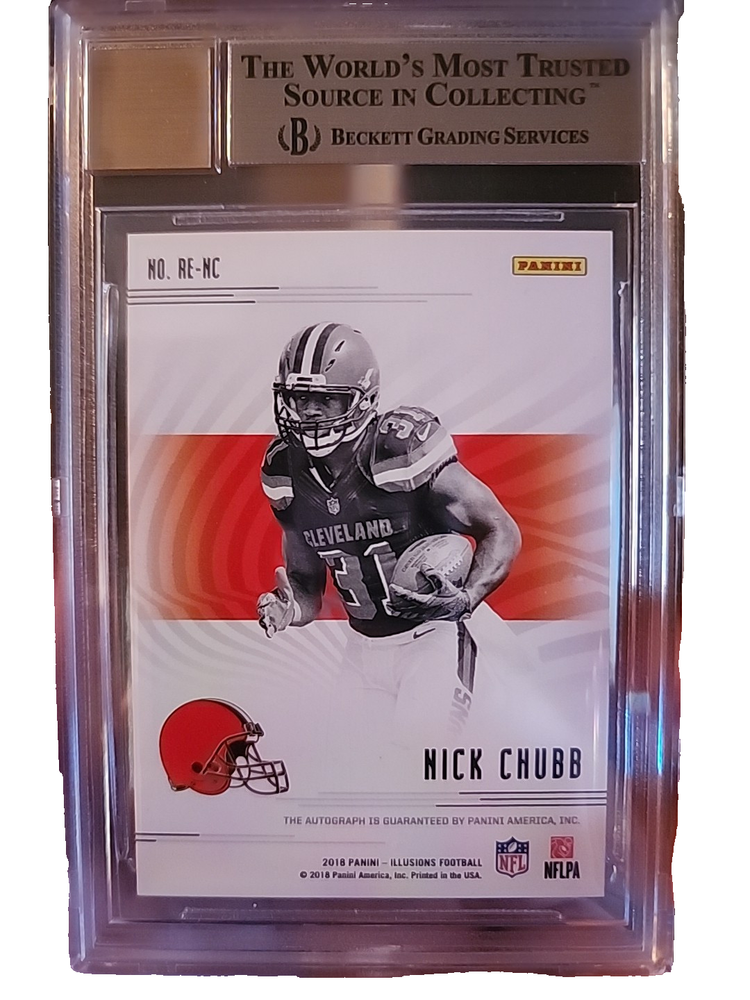 This is a 2018 Panini Illusions Rookie Endorsements Purple trading card featuring Nick Chubb, graded as GEM MINT 9.5 Auto 10. It is a 1/1 card , meaning it is a one-of-a-kind collectible item. The card is professionally graded and certified by Panini, making it a highly sought-after sports trading card for fans and collectors alike.