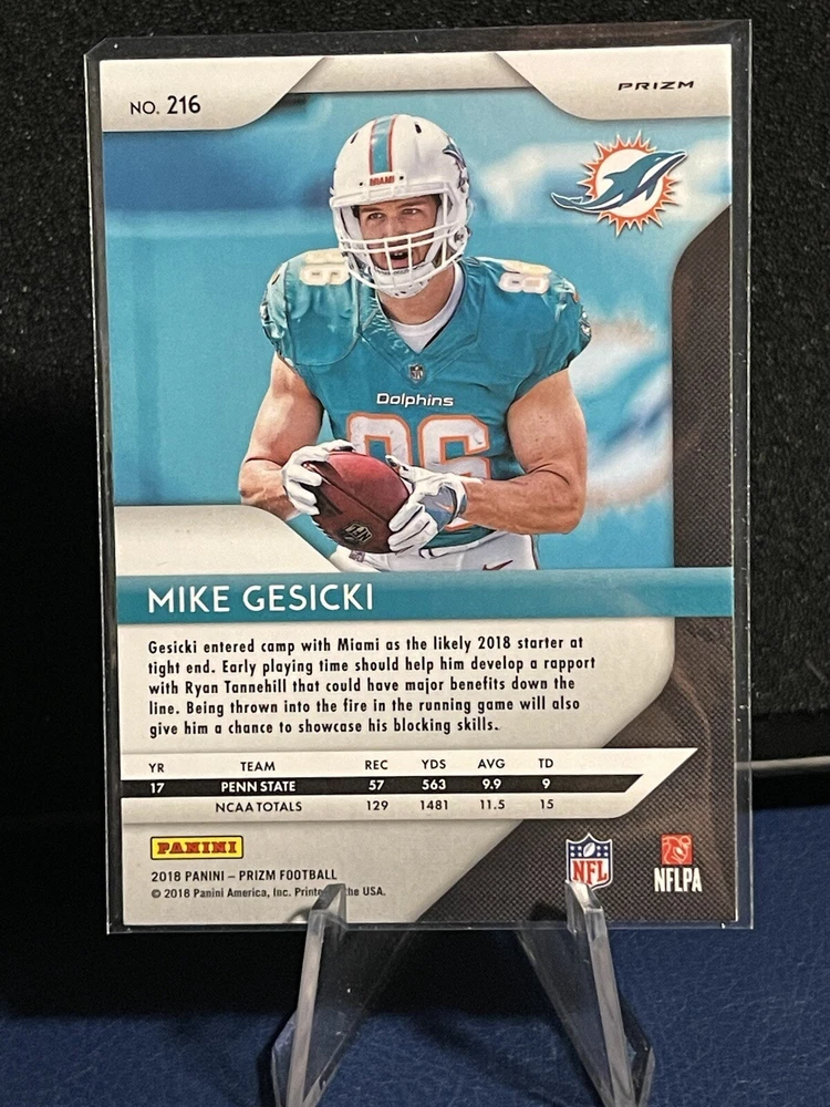This 2018 Panini Prizm trading card features rookie Mike Gesicki from the Cincinnati Bengals of the National Football League. The card is a Silver Prizm variety, making it a unique addition to any sports trading card collection. The card's manufacturer, Panini, has highlighted its features as a parallel/variety card, which makes it an even more special item. This trading card is perfect for avid collectors and fans of the sport alike. Get your hands on this 2018 Panini Prizm Mike Gesicki Silver Prizm Rookie RC card now!