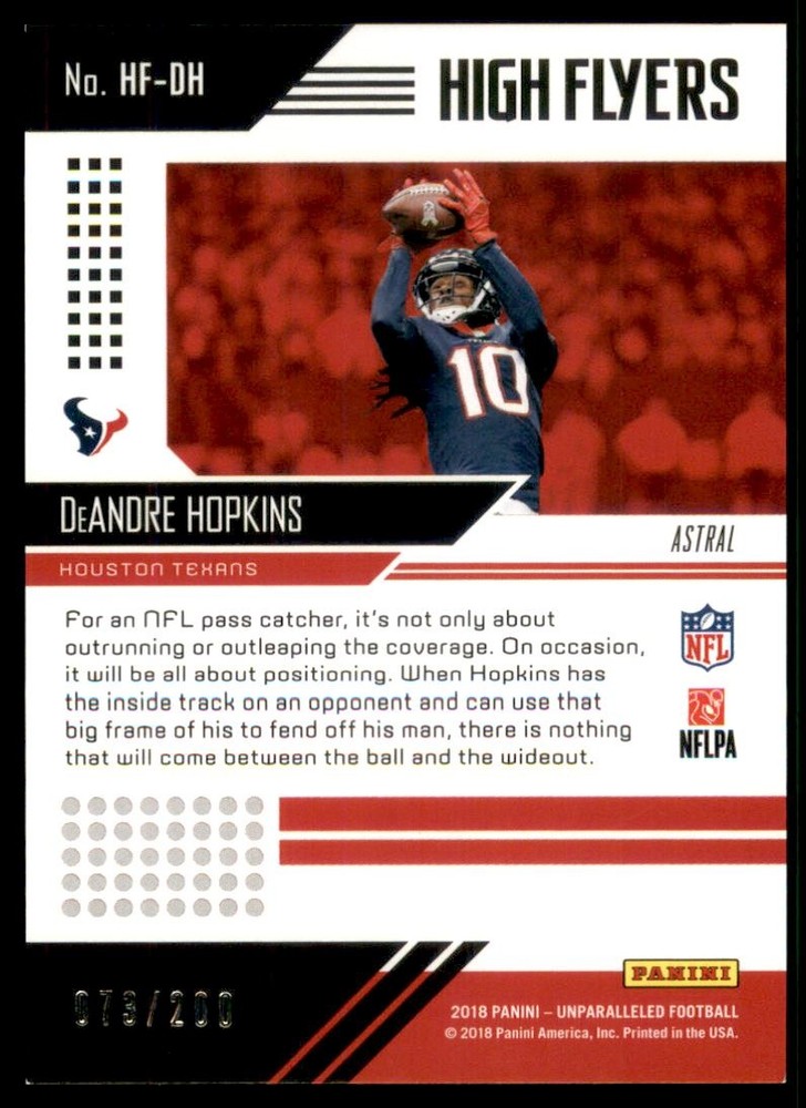 2018 Panini Unparalleled High Flyers Astral #8 DeAndre Hopkins /200 Front Back Sport: Football Set: 2018 Panini Unparalleled High Flyers Astral Year: 2018 Item#: 8 Player: DeAndre Hopkins Team: Houston Texans Attributes: Serial Numbered Brand: Panini Unparalleled Manufacturer: Panini Group Grading Company: Raw Grade SetType: Parallel Insert Item Condition: Near Mint/Mint 2014 Beckett Collectibles, LLC. All Rights Reserved Powered by: Thank you for choosing Burbank Sportscards, the sports cards superstore. We offer a large selection of singles across all sports. Visit our ebay store to view all our items available. Our Shipping Policy We offer Free Standard Shipping to all Domestic customers. Options for Expedited shipping are also available at checkout. For our international customers, shipping is $9.99 for the first item, and $0.25 for each additional item. Note to all customers: To qualify for combines shipping, we ask our customers to add items into the shopping cart. Please note, we do not combine orders that are placed separately. Our Service: Generally, our turnaround is super quick as we process and send out orders same day payment is received. Stock Availability: We do our best to ensure all items are in stock; however, in case of the rare stock out, the customer will have the option for a replacement card, or we will process a refund so the order is not held up. Our Images: Many of our images are stock photos from Beckett archives. They are a representation of the actual card you would receive. If you have any questions regarding the item you're interested in, please feel free to ask (serial numbers and relic pieces may vary) Moreover, in a case of a wrong or defective photo, please notify us, so we can adjust it. Other FAQ's: -When buying multiple cards, do you top load each item? No; however, we do try to insure all items are shipped securely. If you wish to have all of your cards top loaded it is a paid service and can be arranged. Please email for more details. For other questions, please feel free to ask. Thank you.
