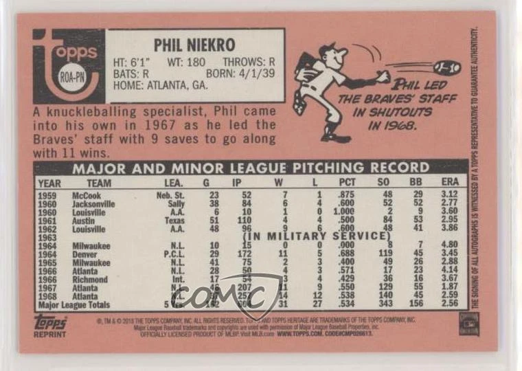 2018 Topps Heritage High Number - Real One Autographs #ROA-PN Phil Niekro - Baseball Card - Featuring the Atlanta Braves - Featuring Phil Niekro Search for more: 2018 Topps Heritage High Number Search for more: 2018 Topps Heritage High Number - Real One Autographs View all of our Listings Auctions Buy It Now About Us Located in the beautiful Pacific Northwest, COMC (Check Out My Cards) is the world's largest consignment service for trading card singles. More than 10,000 people have used our consignment service to list over 50 million trading cards. Find out how we can help you consign your items on eBay by contacting us through eBay messaging. COMC -- "The Safe & Easy Way to Buy & Sell" Representative Image - Select Specific Item above to see image of actual item Representative Image - Select Specific Item above to see image of actual item Raw Condition for Modern Cards Unless otherwise noted, raw modern cards are listed in Near Mint-Mint condition or better. A NM-MT card appears to be Mint at first glance, but upon closer inspection, may exhibit some of the following: minor print defects (e.g. roller marks, print line, dimple), minor scratches, slight edge wear, and slight corner wear. Centering is clearly visible in the images provided and does not factor into our condition assessment. Raw Condition for Vintage Cards Unless otherwise noted, raw vintage cards are listed in Excellent condition or better. An EX card may exhibit some of the following: minor rounding of corners, surface wear, print defects, light scratches, and slight edge wear/chipping. Centering is clearly visible in the images provided and does not factor into our condition assessment. Domestic Shipping Combined shipping for multiple items is available. To receive combined shipping, please ensure all desired items are in your eBay shopping cart before proceeding to checkout. eBay limits orders to 40 items per order. We automatically combine multiple orders placed on the same day. If you place multiple orders on the same day, please contact us to request a refund of applicable shipping costs. Signature confirmation may be required on invoices over $400. All cards are protected and shipped securely. International Shipping COMC offers eBay's International Shipping (EIS) for international orders under $2,500* (see country exceptions below). All duties and import fees are paid at checkout; in the rare event that there are additional import fees upon delivery, these are borne by the buyer. EIS packages route through a shipping hub in Erlanger, KY before shipping to their final destination. Please note that EIS does not allow for combined shipments. The shipping rates are determined by eBay and cannot be adjusted. *Maximum sale price exceptions: Colombia, Kuwait ($2,000); Taiwan ($1,539); Chile, Costa Rica, Guatemala, Honduras, Trinidad and Tobago ($1,000); Antigua and Barbuda, Aruba, Belize, Dominica, Grenada, Philippines, Saint Kitts and Nevis, Saint Lucia, Montserrat, Turks and Caicos Islands ($500); Dominican Republic, El Salvador ($200). Please request a shipping quote through eBay messaging for orders that exceed the maximum sale price supported by eBay's International Shipping. You will be responsible for all duties and import fees for international orders shipped outside the EIS. All cards are protected and shipped securely. Payment COMC does not accept offers on our cards through our eBay storefront. COMC utilizes eBay’s managed payments system. If you are experiencing difficulties making a payment, please contact eBay for assistance. Return Policy Returns are only accepted on the rare occasion the item is not as described. If you are making a return, please initiate the return process through eBay so a mailing label can be provided for you. Prior to listing, our expert team carefully assessed this item to represent it accurately. Please review the description and high-definition images prior to purchasing to ensure this item meets your satisfaction. We welcome you to contact us if you have further questions about this item. Trust and Integrity COMC carefully assesses each item consigned to us to prevent fraudulent items from entering the marketplace. If you believe an item offered on COMC may be fraudulent, please contact us with details so we can investigate the issue. Items we determine are outside our supported items policy may be removed. Last Modified: 2/1/2025 10:11:43 AM PDT